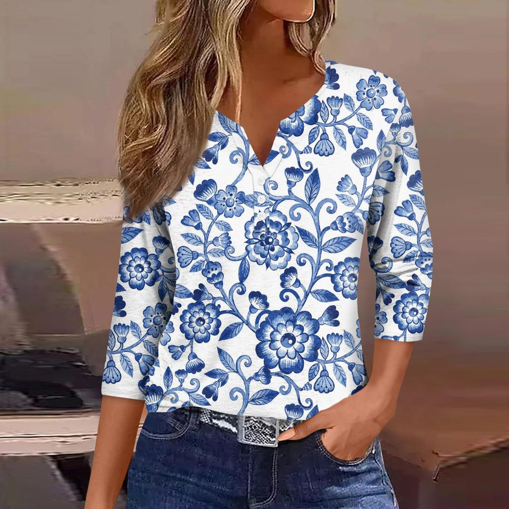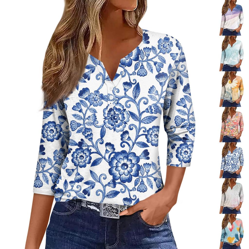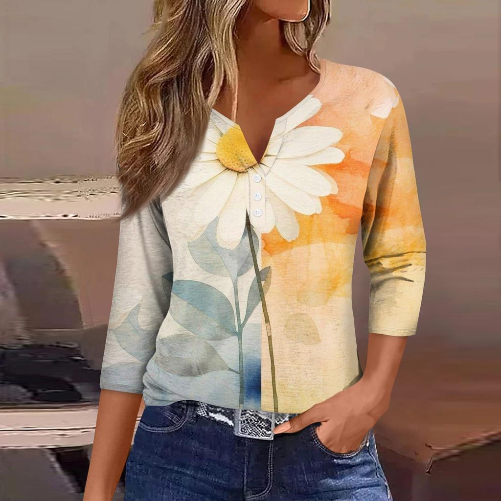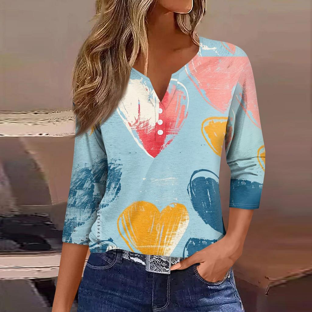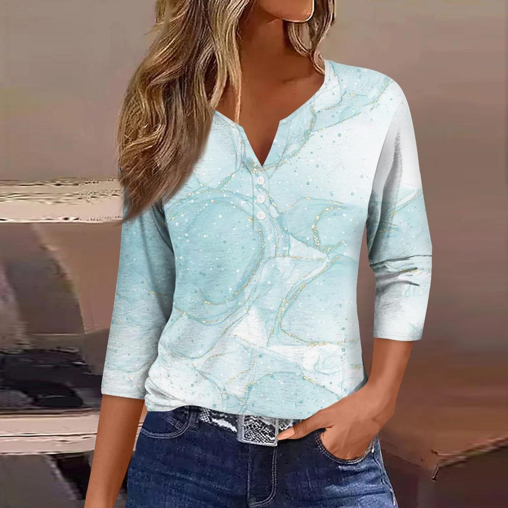 Женская модная повседневная футболка с коротким рукавом и V-образным вырезом, декоративными пуговицами и рукавом три четверти