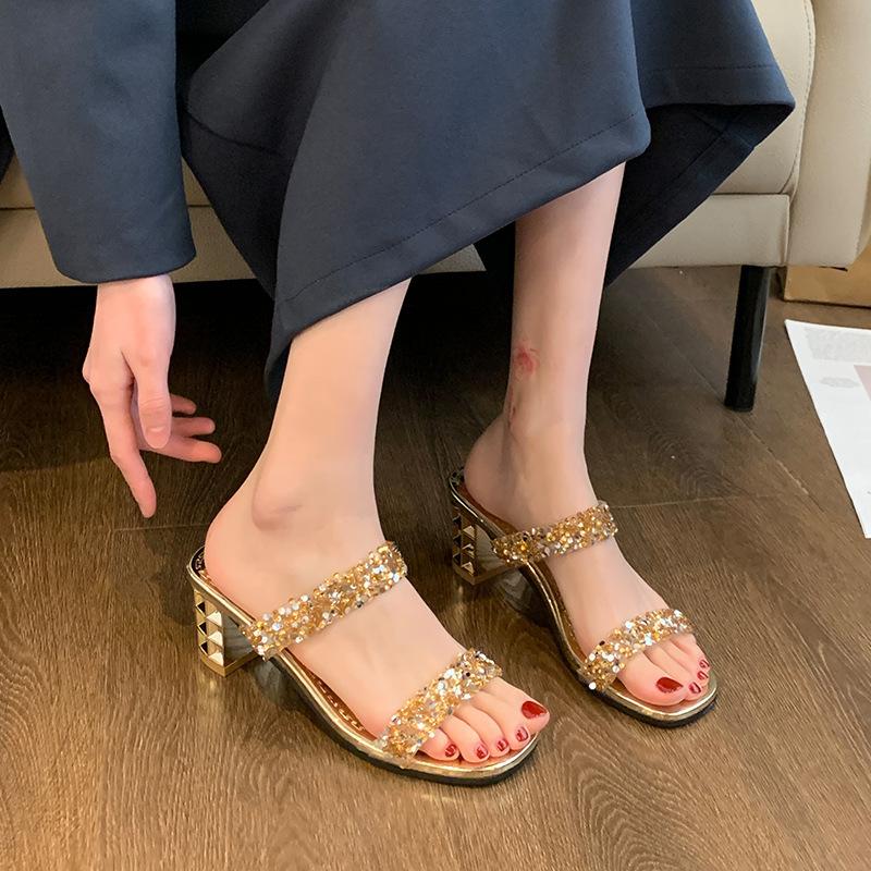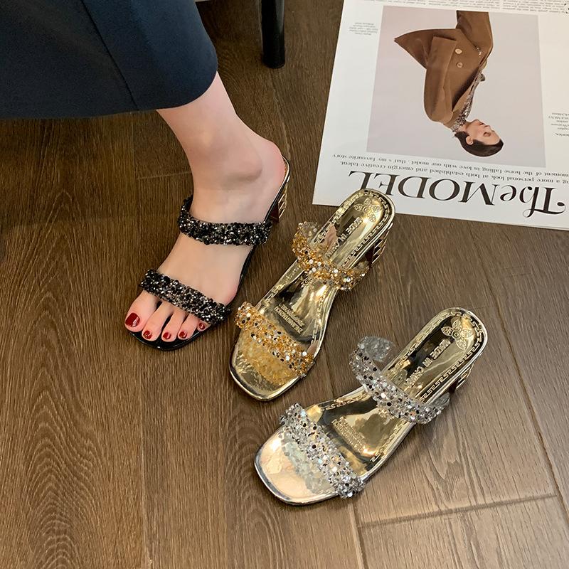 Модные классные тапочки женские летние 2024 года новые модные односложные тапочки со стразами на среднем каблуке резиновые тапочки верхняя одежда
