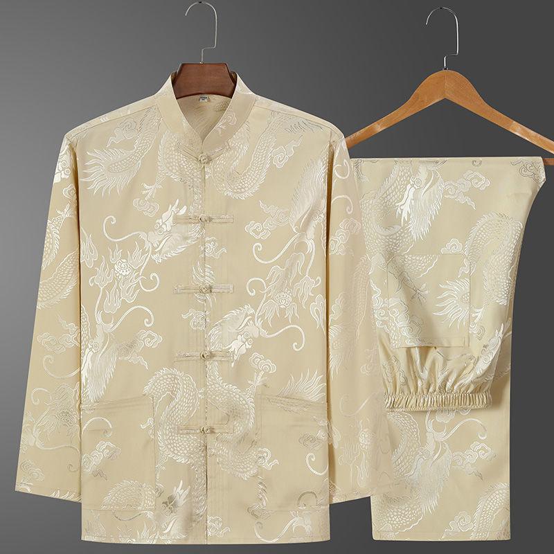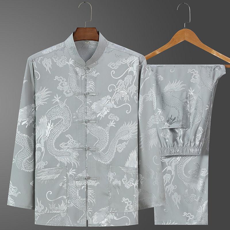 Весенний комплект одежды для пожилых людей среднего возраста Тан, мужская атласная рубашка с длинными рукавами в стиле дракона и кунг-фу в китайском стиле больших размеров для тренировок