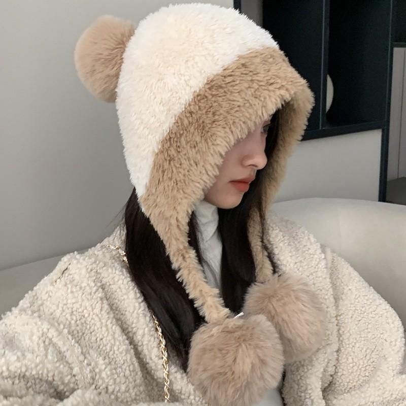 Зимняя шапка от холода с большой окружностью головы, плюшевая подвесная шапка с шариком, милая защитная шапка для защиты ушей, детская толстая плюшевая вязаная шапка с цветными блоками