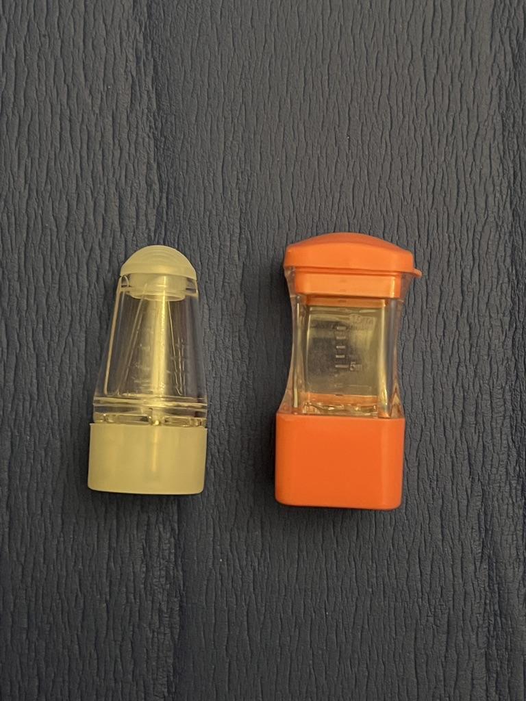 Вот сравнение двух видов этих штучек. Белая (конус) меньшего объема 7 мл, штырьки тонкие, защитная крышка силиконовая, держится плотно,. У квадратной розовой объем 14 мл, штырьки толще, крышка жесткая пластиковая, она держится неплотно,. Использовать удобнее розовую. Если наливать в нее столько средства, чтобы сразу его расходовать, то легко снимающаяся крышка не проблема.