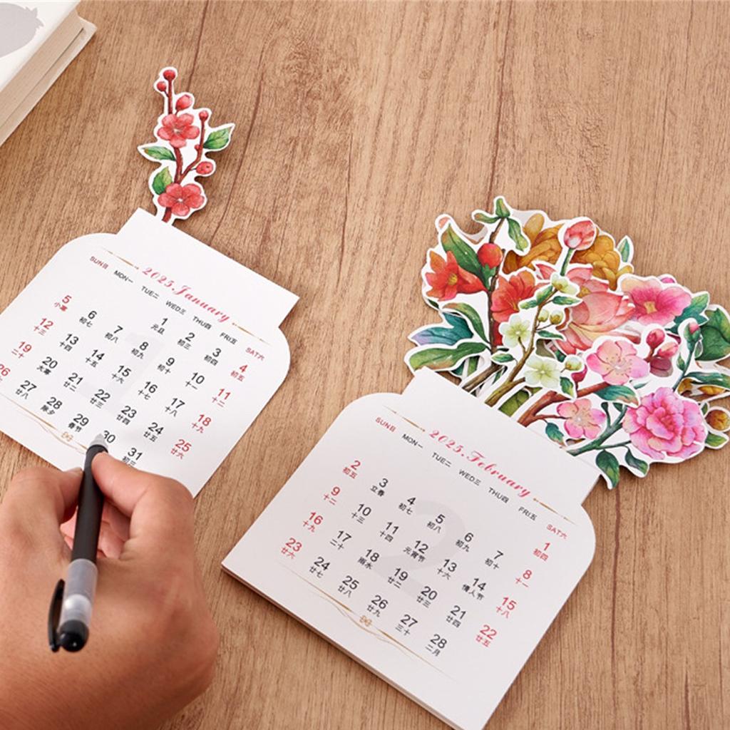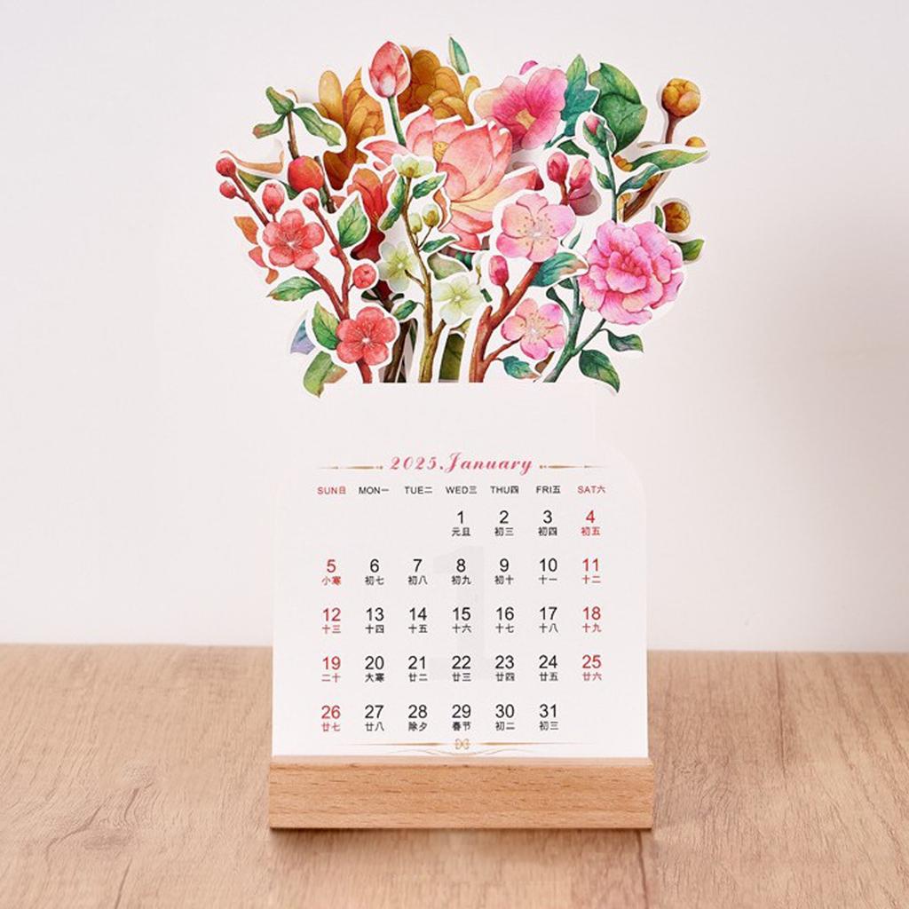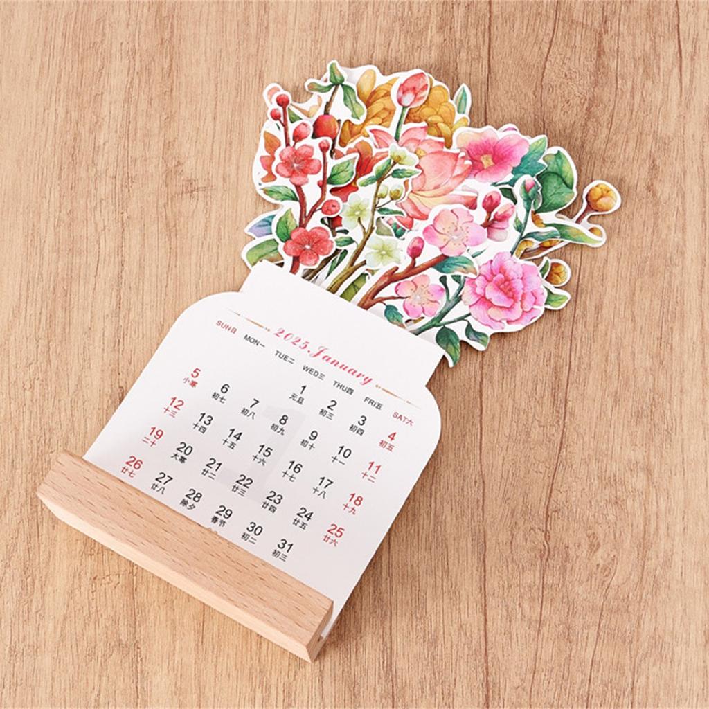Настольный календарь 2025, креативный настольный календарь с цветочным рисунком на деревянной основе, новогодний ежемесячный календарь-планировщик в форме вазы, перекидной декоративный