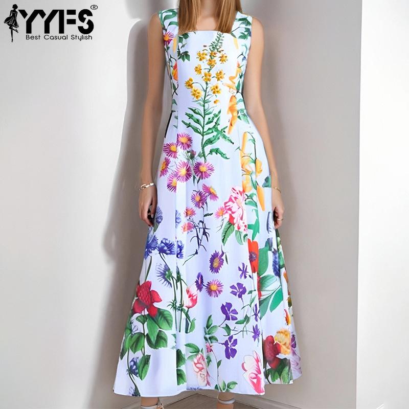 YYFS Женская мода лето весна цветочный узор принт без рукавов с квадратным воротником с высокой талией повседневные платья