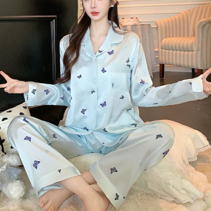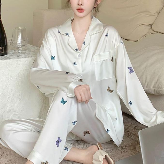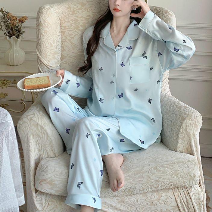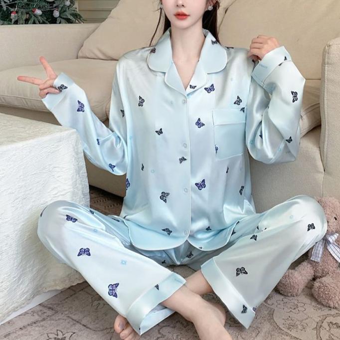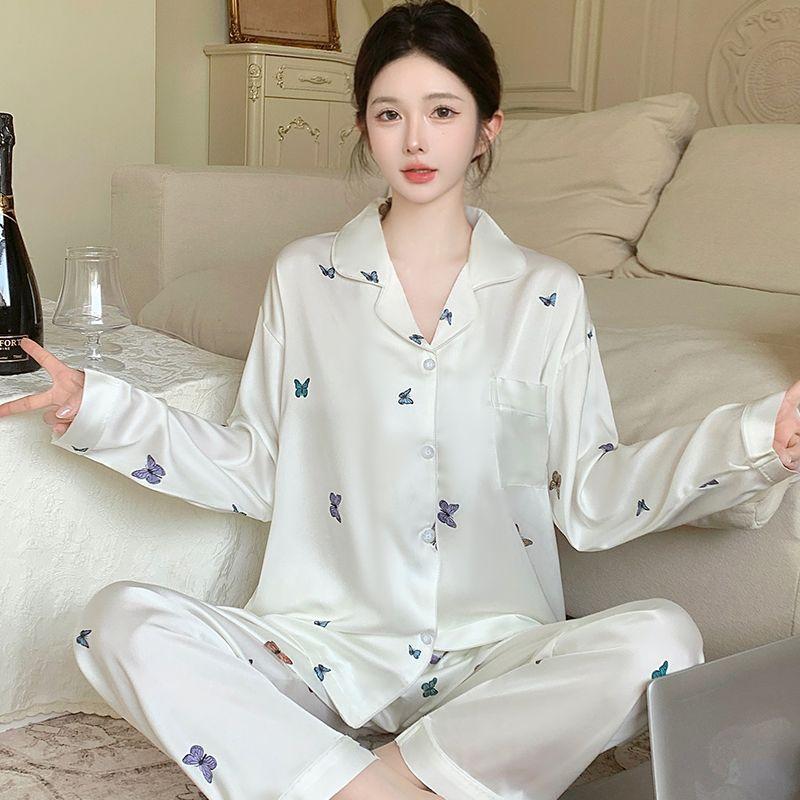 2025 Весна Осень Комплекты из 2 предметов с милым принтом бабочек Женская пижама из искусственного шелка и атласа Пижамный комплект с длинными рукавами Пижама женская Домашняя одежда