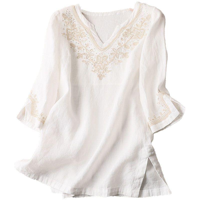 Летняя рубашка из хлопка и льна с V-образным вырезом и вышивкой для женщин с нишевым дизайном, легкая белая рубашка свободного кроя с семью рукавами для женщин