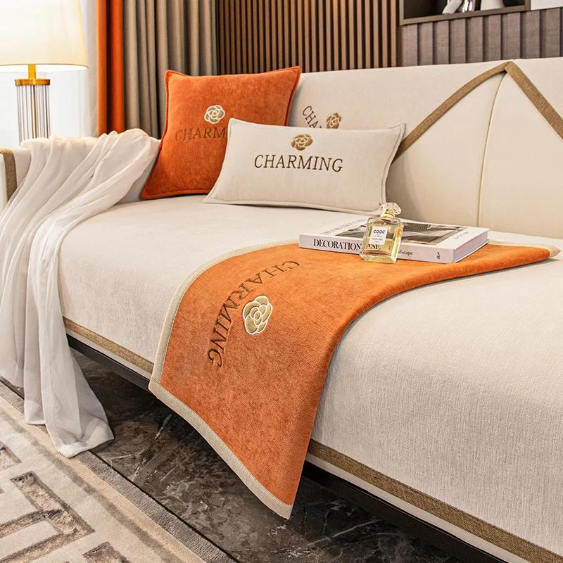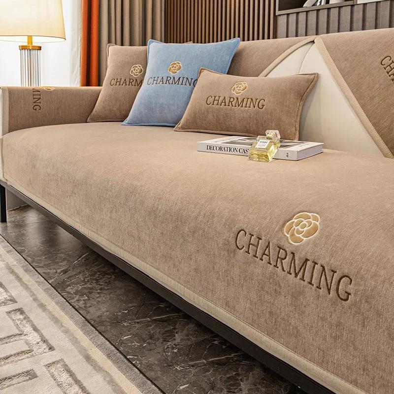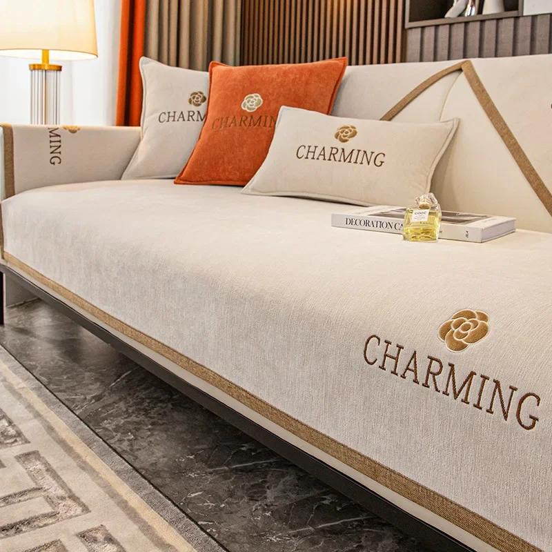 Modern Chenille Roses Embroidery Sofa Cover Non-slip Towel Pillowcase Decore Home L-shaped Sofa Cushion Four Season Universal
