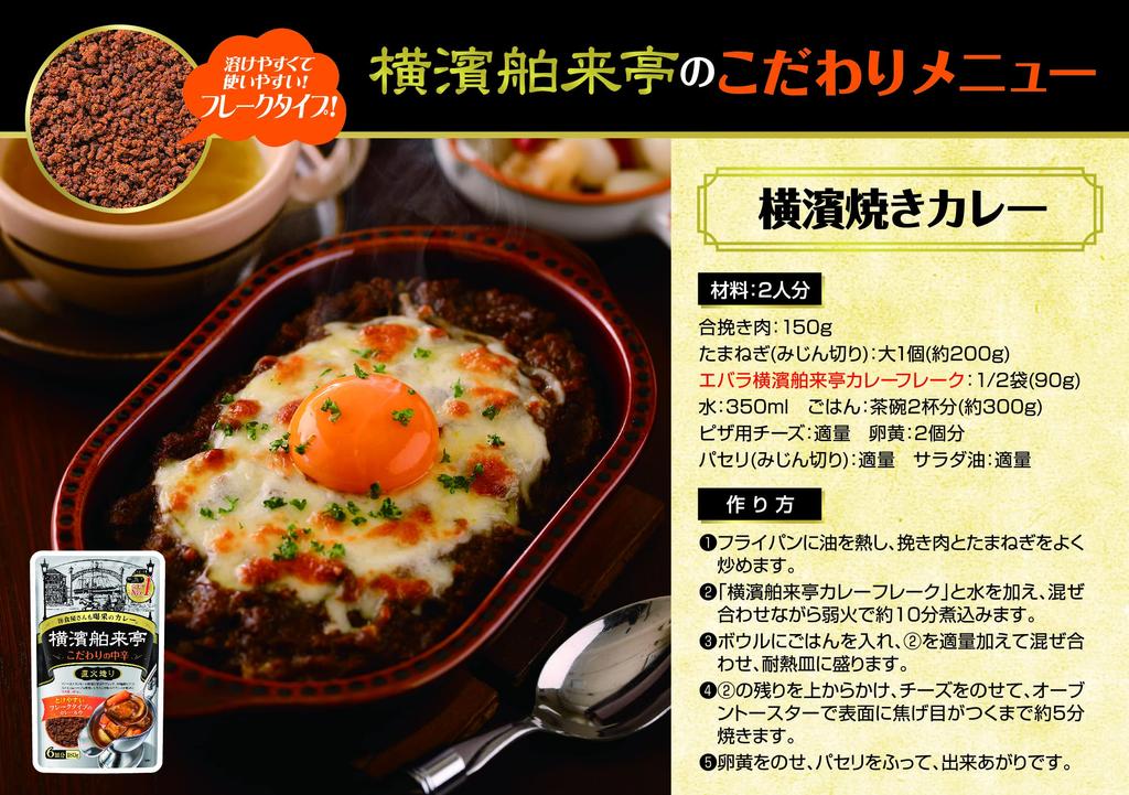 Особые среднеострые хлопья карри Yokohama Kyoraitei изготавливаются путем тщательной выпечки пшеничной муки и легкоплавкого жира. (сало) в высокотемпературной печи на открытом огне до коричневого цвета, затем смешиваем овощи, фрукты и более 20 видов специй, что облегчает использование. Это хлопьевидная карри-ру.
