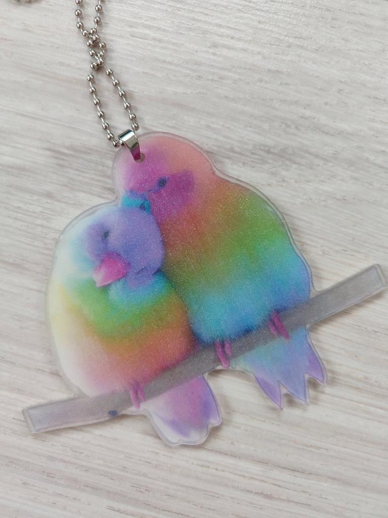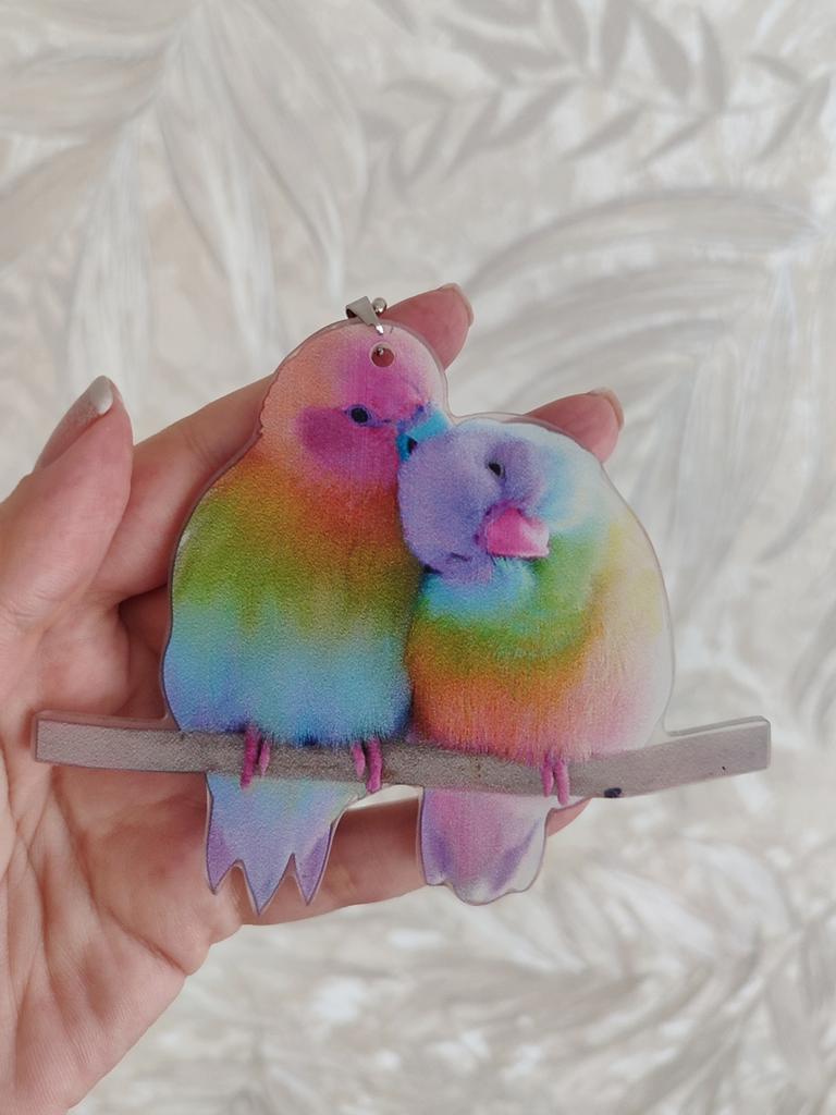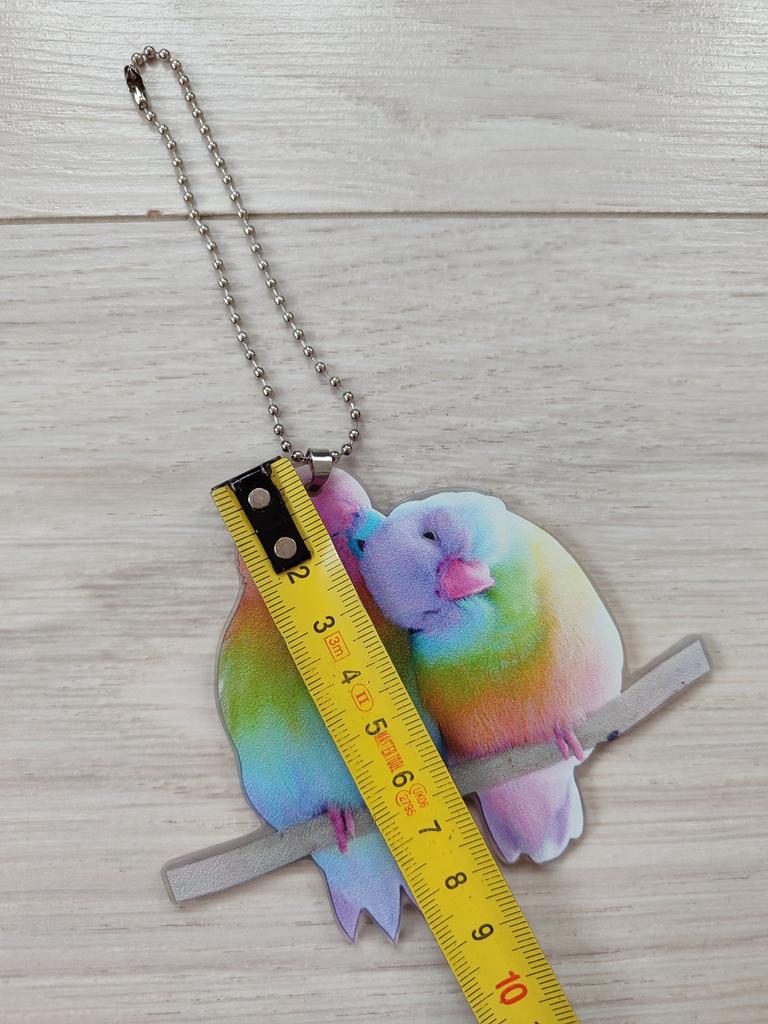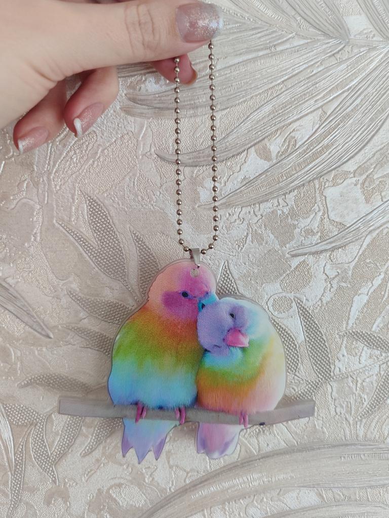 Милые попугаи подвеска. Декоративный акриловый брелок-подвеска для рюкзака, автомобиля, украшение на ёлку, или любого другого декора. Я заказала, чтоб подвесить на рюкзак, яркий и симпатичный аксессуар. Крепится легко на цепочку, в комплекте также идёт замочек-петелька. Размер: 10,5*8,5 см. Подвеска из акрила, плоская, одна сторона гладкая, глянцевая, другая сторона матовая, шершавая. Рисунок четкий и реалистичный, смотрится супер. Доставка заняла 21 день до отделения Укрпочты, соборная посылка Joom. Классная подвеска, украшает рюкзак и умиляет, могу рекомендовать к покупке.