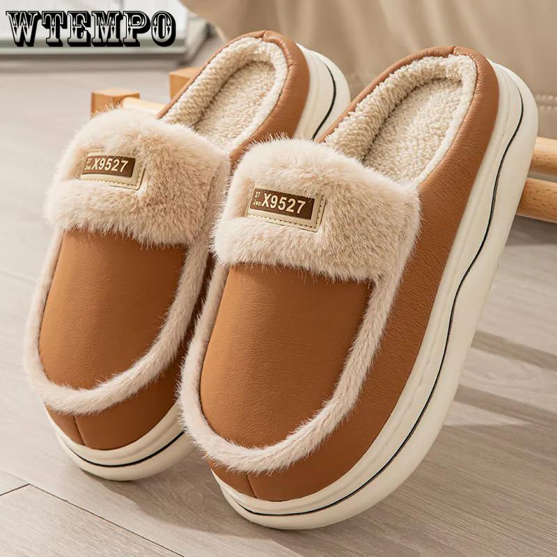 WTEMPO Пара ПУ толстый плоский каблук плюшевые теплые домашние тапочки искусственная кожа закрытый носок осенне-зимние хлопковые тапочки