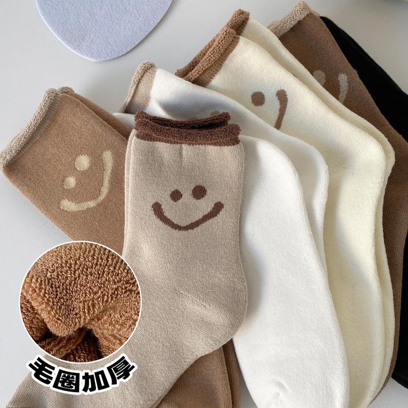Теплые махровые носки женские плюшевые утолщенные средние носки-трубы модные милые универсальные носки-полотенце со смайликом