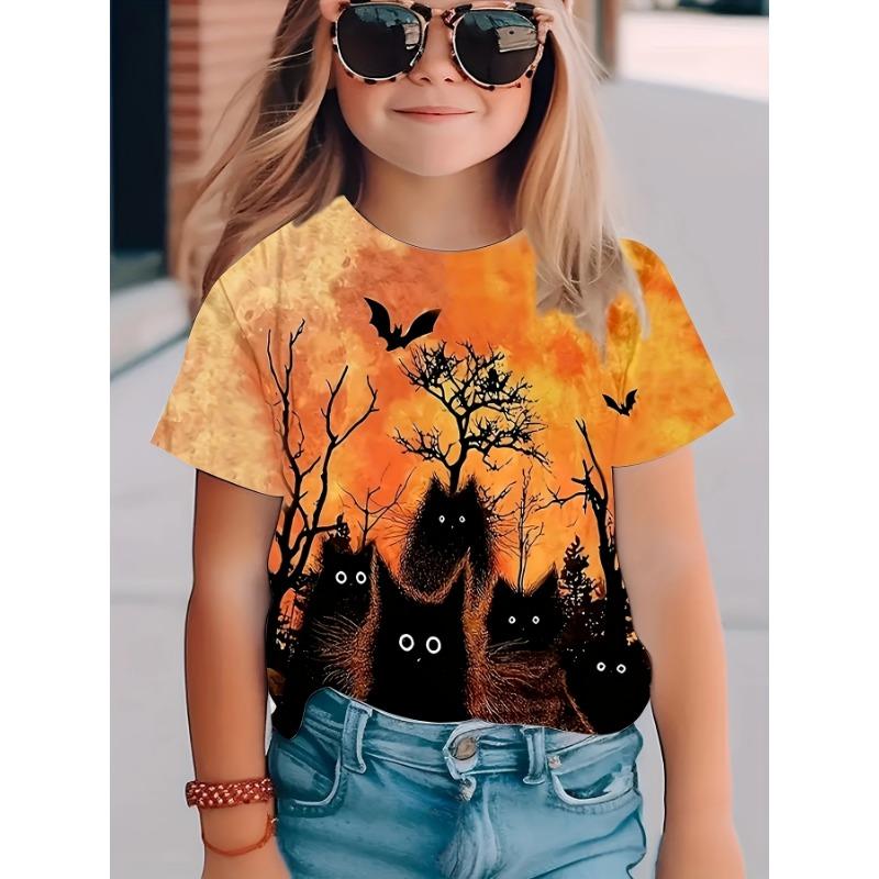 Повседневная свободная детская футболка с принтом «Черные кошки и летучие мыши» на Хэллоуин, круглый вырез, слегка эластичный летний трикотажный топ