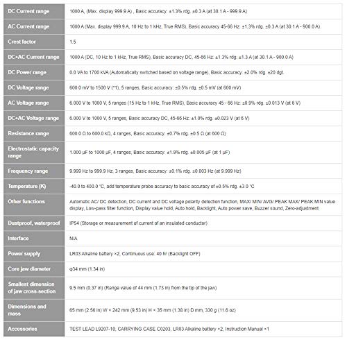 [Постоянный ток] 999,9 А [Переменный ток] 999,9 А [Коэффициент амплитуды] Диапазон 1000 А: 1,5 [переменный + постоянный ток] 999,9 А