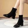 Короткие сапоги на высоком каблуке, женские плюшевые утеплители 2024 года, модные осенне-зимние новые лоскутные сапоги с квадратным носком в стиле ретро