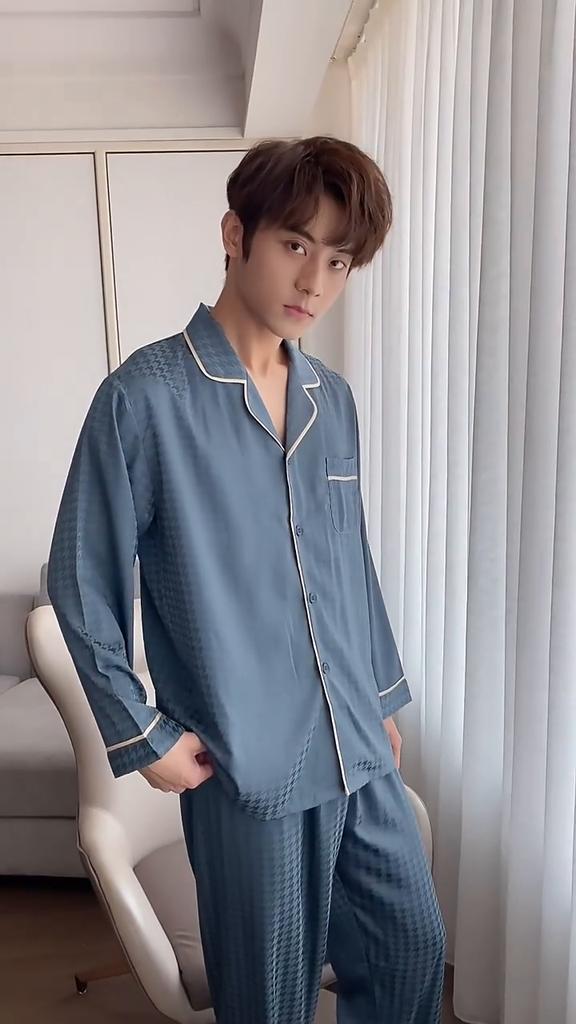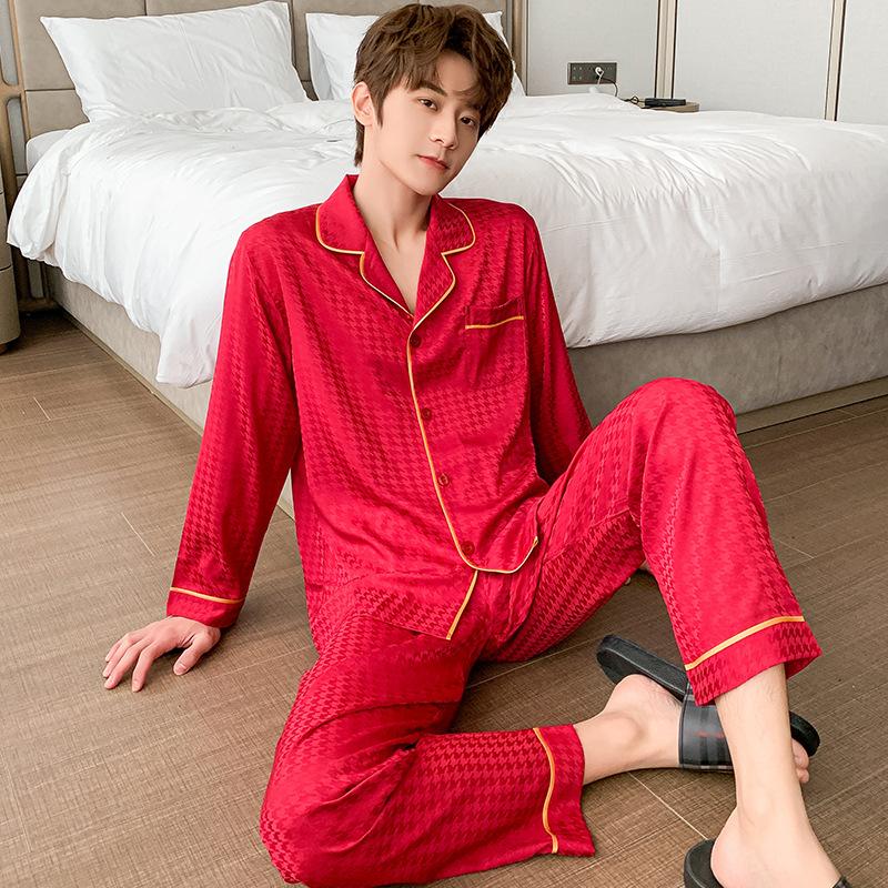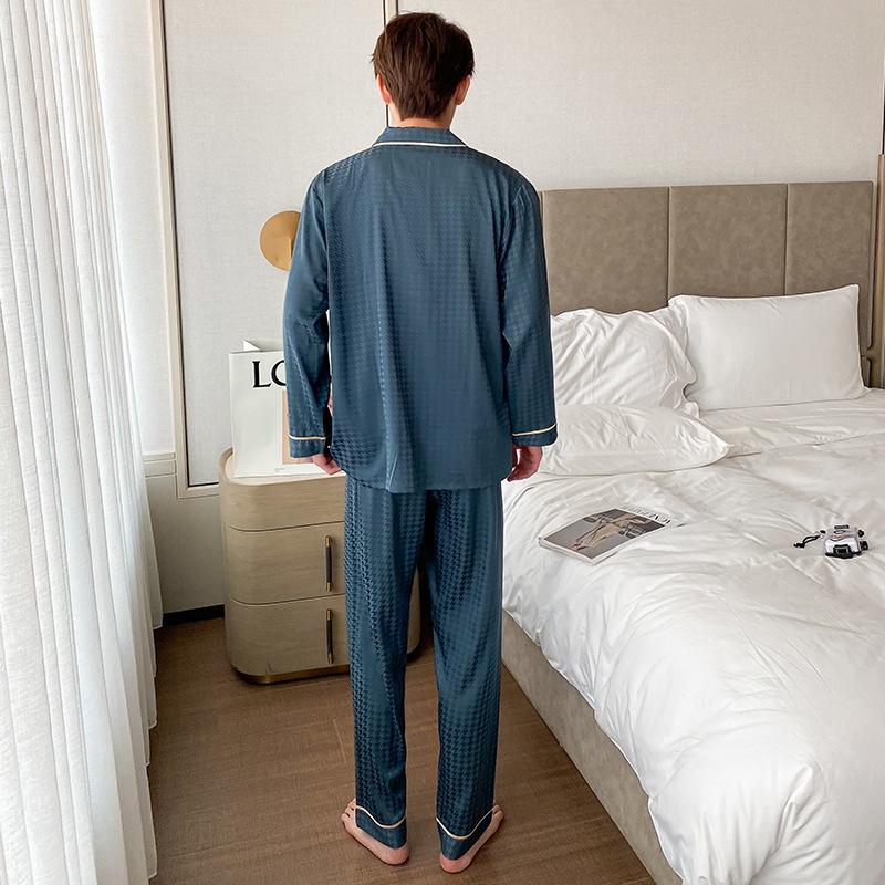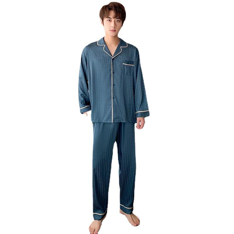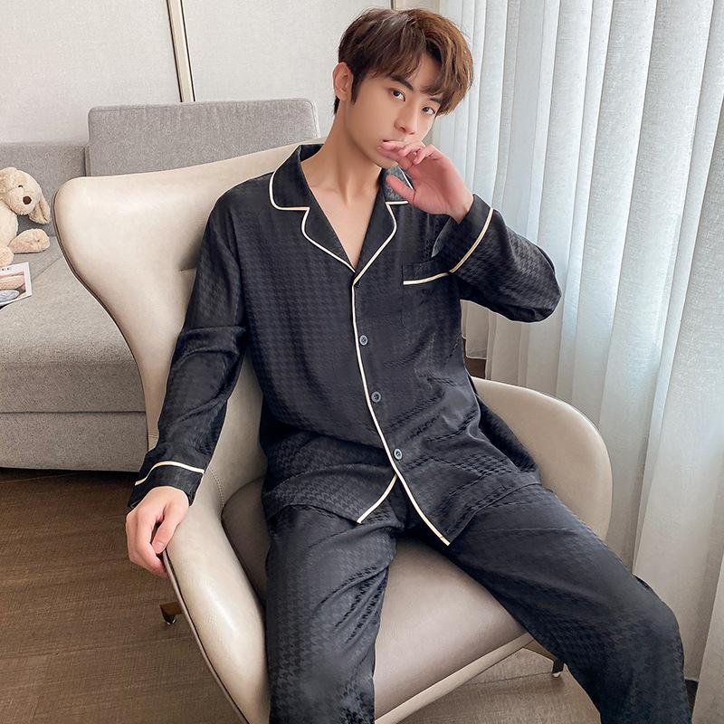Мужская домашняя одежда из шелка Ice Silk, весенняя и осенняя, комплект из 2 предметов, пижамный комплект с длинными рукавами, летняя тонкая жаккардовая домашняя одежда с узором «гусиная лапка»