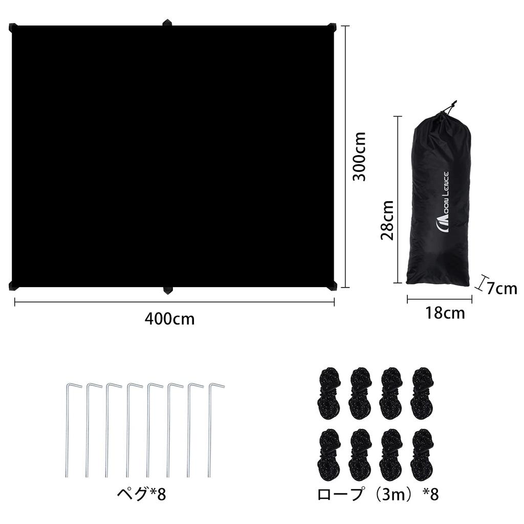 [Характеристики брезента] Ткань: 190T полиэстер, черное резиновое покрытие / Устойчивость к давлению воды: 3000мм / Размер корпуса: 3м x 4м / Размеры хранилища: приблизительно. 28x18x7см / Вес набора: приблизительно. 1,34 кг (включая колышки и веревки) СОДЕРЖАНИЕ: Тентовый корпус x 1, гибкий канат x 8, колышки x 8, сумка для хранения x 1 (Пожалуйста, обрати внимание: столбы не входят в комплект поставки данного товара. Пожалуйста, приобретите отдельно. )