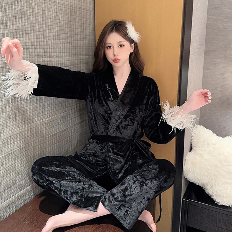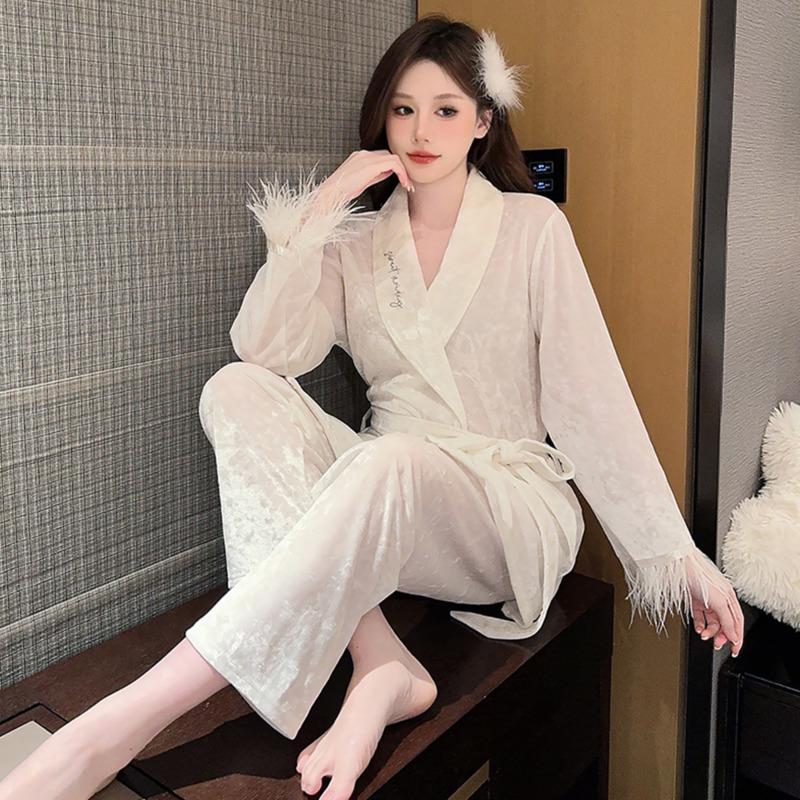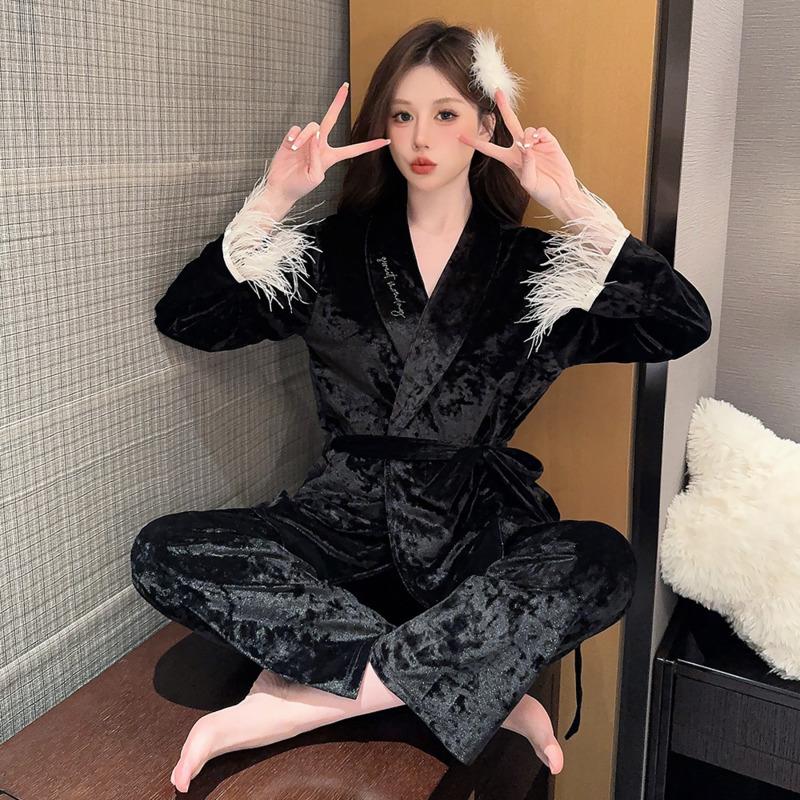Осенне-зимняя пижама из бархата в полоску с золотыми и ромбовидными перьями, женская домашняя пижама из двух предметов