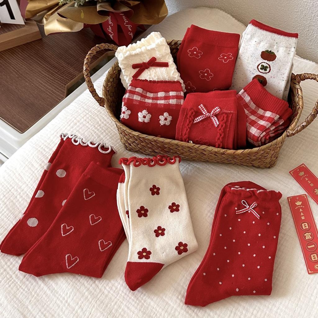 Знак на год рождения Большие красные новогодние носки женские Mori Bow Маленький цветок Любовь женские хлопковые носки средние носки-трубы