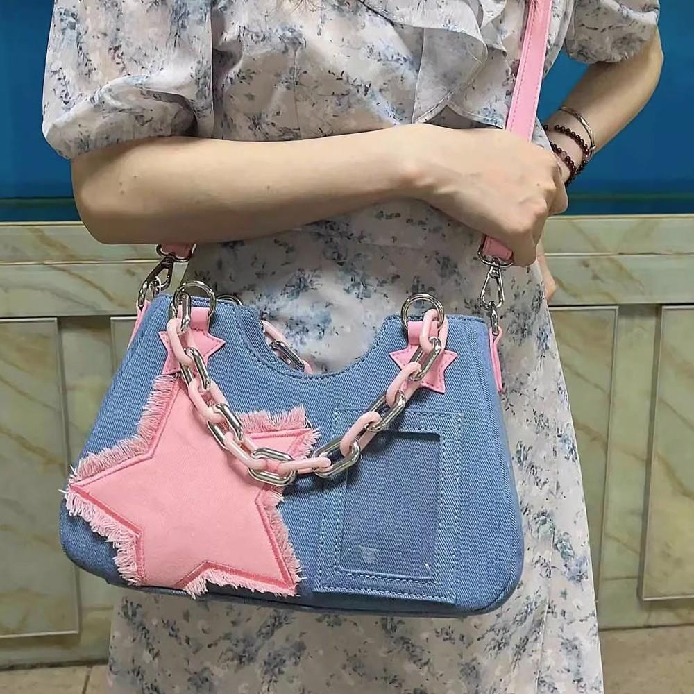 Сумка Splicing Hit Color Handbag Niche Design Chain Cowboy Handbag Star American Retro Shoulder Bag New Women's Bag