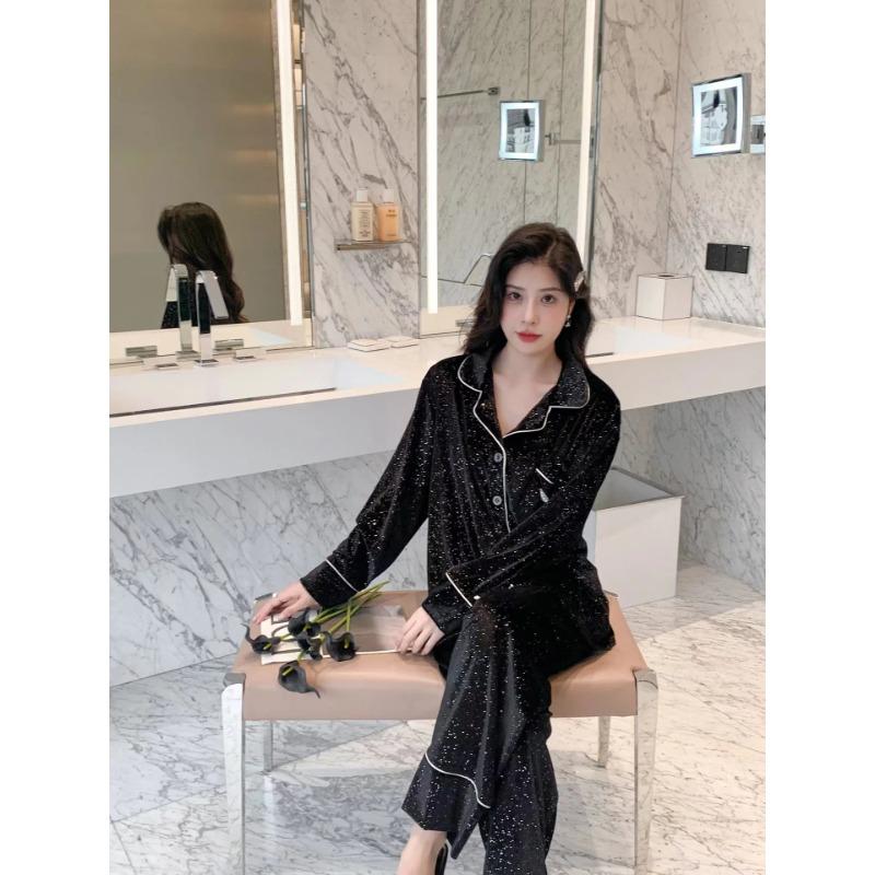 Пижама из золотого бархата для женщин, новая осенне-зимняя, с длинным рукавом, черная, легкая домашняя пижама