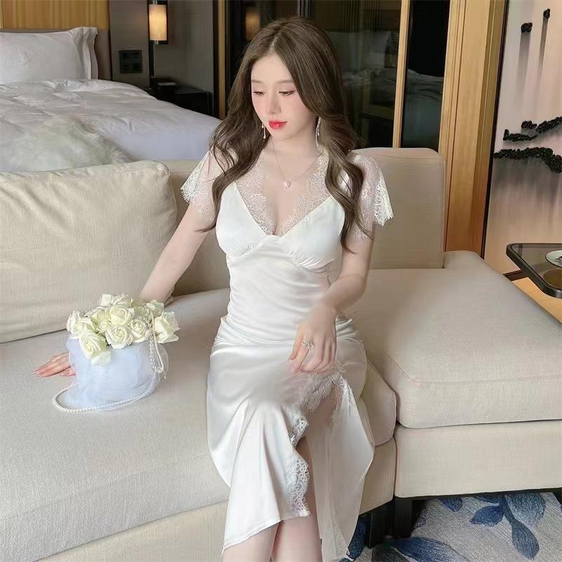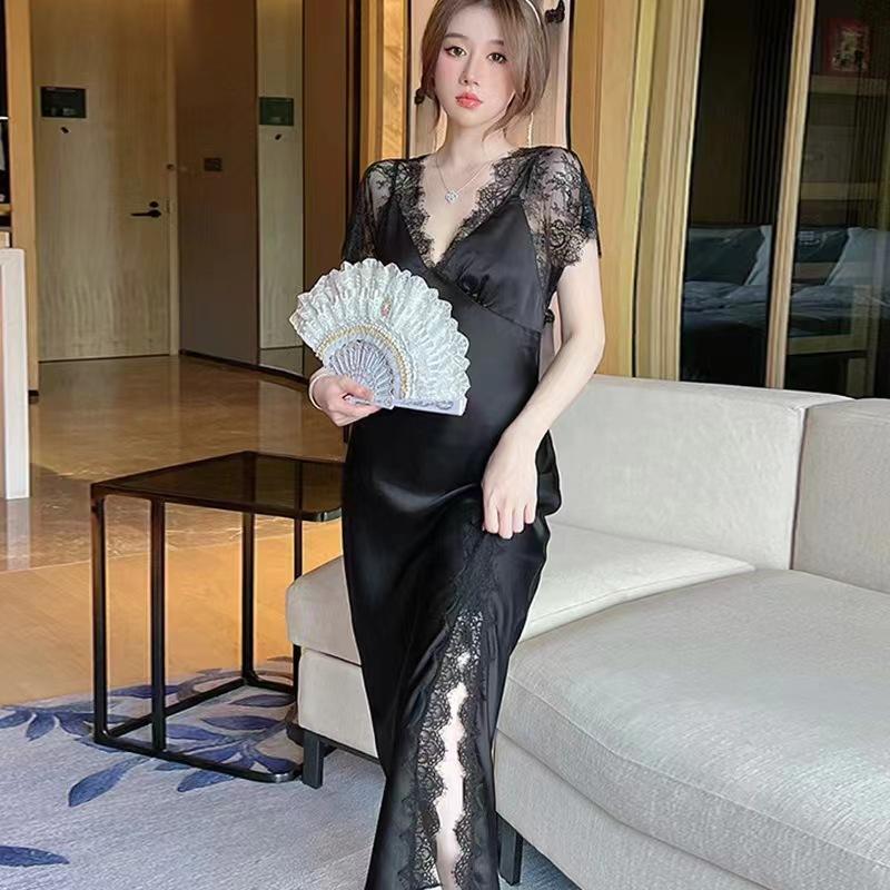 Новая пижама для женщин весна-лето ночная рубашка из тонкого ледяного шелка с разрезом средней длины ажурная кружевная пижама ночная рубашка