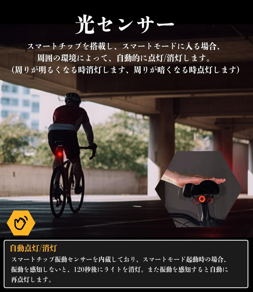 Датчик освещенности и автоматическая вспышка: Этот велосипедный задний фонарь оснащен умным чипом, и когда он обнаруживает высокочувствительные инфракрасные лучи днем, датчик света автоматически выключает фонарь. Он автоматически включится, если почувствует недостаточное освещение.. Также, если в течение 120 секунд не будет обнаружено вибрации, он автоматически выключится, а задний фонарь включится, как только обнаружит вибрацию. (применимо к умному режиму. Один индикатор будет мигать в умном режиме) )