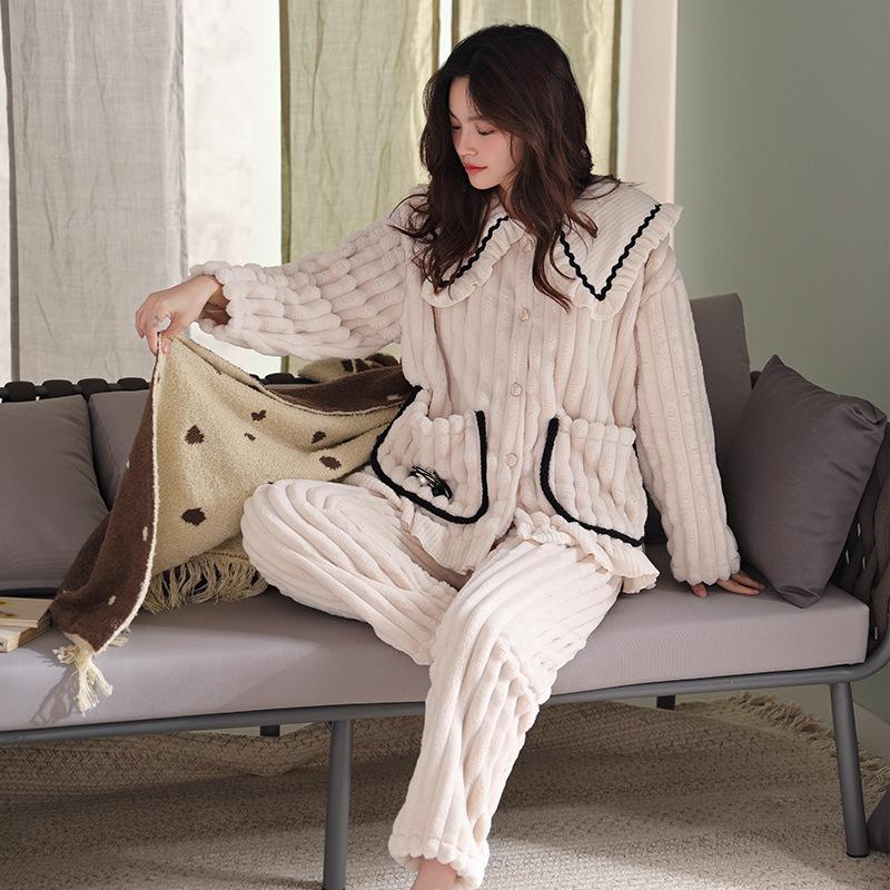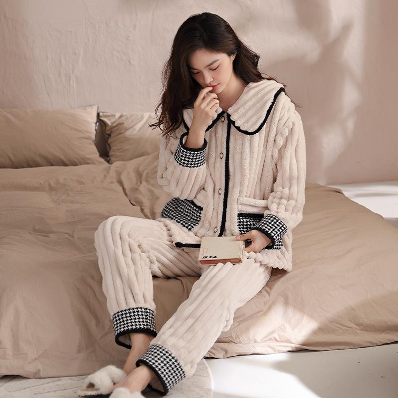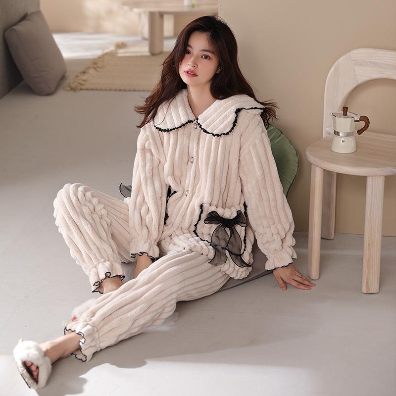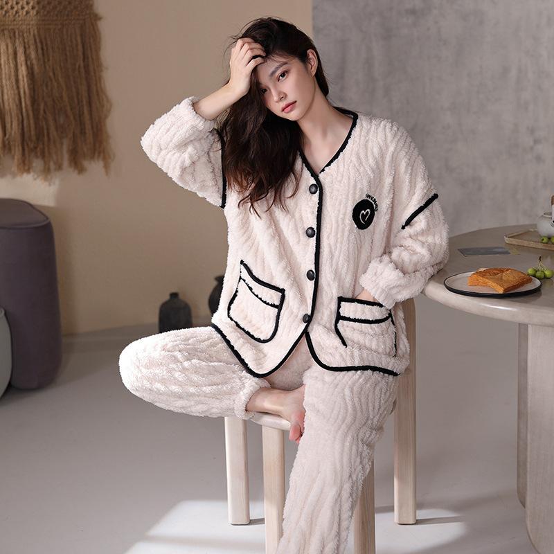 Новая женская пижама, зимний коралловый бархатный кардиган с отворотами, утолщенная теплая фланель, повседневная домашняя одежда, пижамный комплект