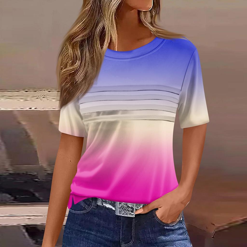 Женская плиссированная футболка с круглым вырезом и градиентным принтом, короткий рукав, топ с разрезом по низу