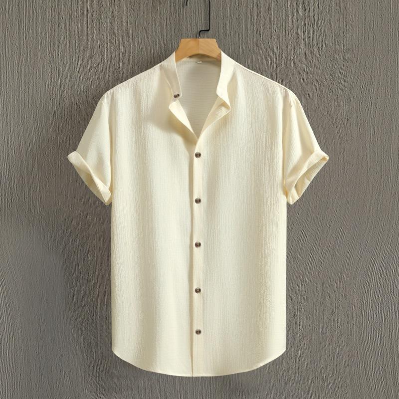 Летние рубашки, модная повседневная рубашка с воротником-стойкой и короткими рукавами, однотонная рубашка из хлопка и льна, мужской топ