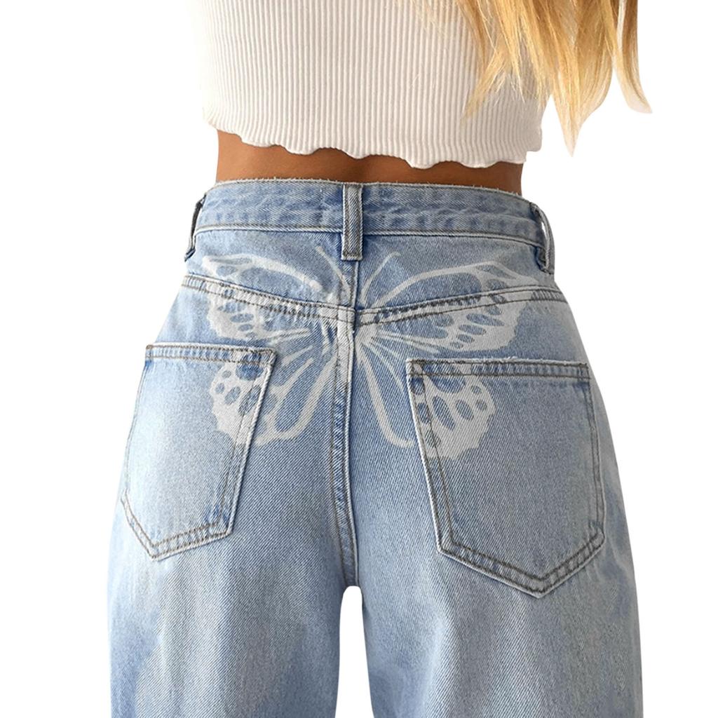 Женские широкие брюки с принтом бабочки, прямые брюки, брюки, джинсы