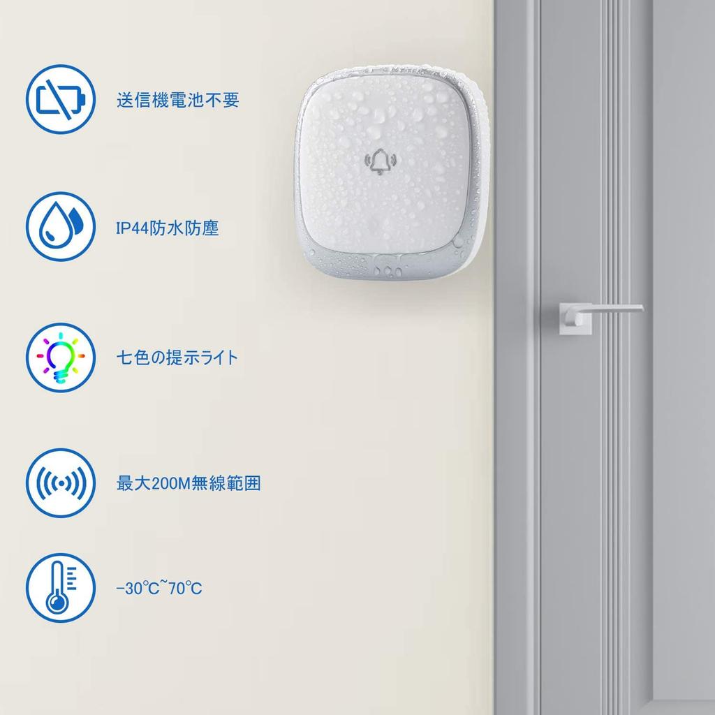 [Водонепроницаемая и пыленепроницаемая, энергосберегающая конструкция, не требующая батареек] Автоматический передатчик генерации электроэнергии не требует батареек, что делает его экономичным и энергосберегающим.. Передатчик кнопки звонка имеет степень водонепроницаемости IP44 и обладает превосходными водо- и пылезащитными свойствами, что позволяет использовать его на открытом воздухе и в ванной комнате.