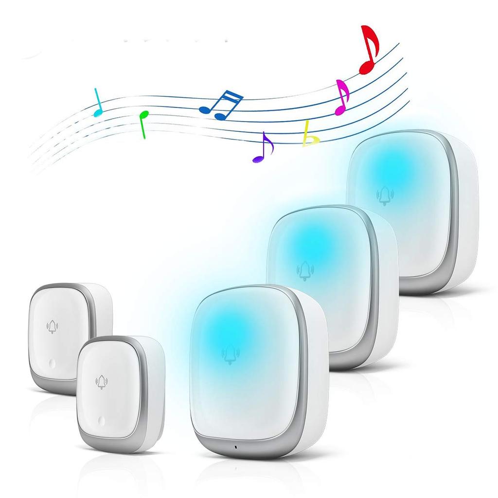 [Звонок с 7 цветными огнями и 38 выбираемыми звуками] При нажатии на передатчик входного звонка раздастся мелодия звонка, и в то же время 7 цветных светодиодных огней начнут мигать, чтобы уведомить вас. Очень полезно для пожилых людей или людей с нарушениями слуха.. Вы можете выбрать мелодию из 38 песен. Благодаря световым и звуковым оповещениям, а также удобному беспроводному звонку вы сможете быстро заметить и почувствовать себя в безопасности в случае возникновения чрезвычайной ситуации.