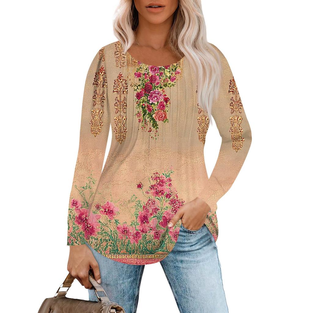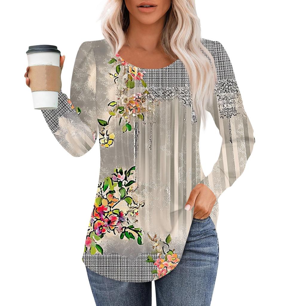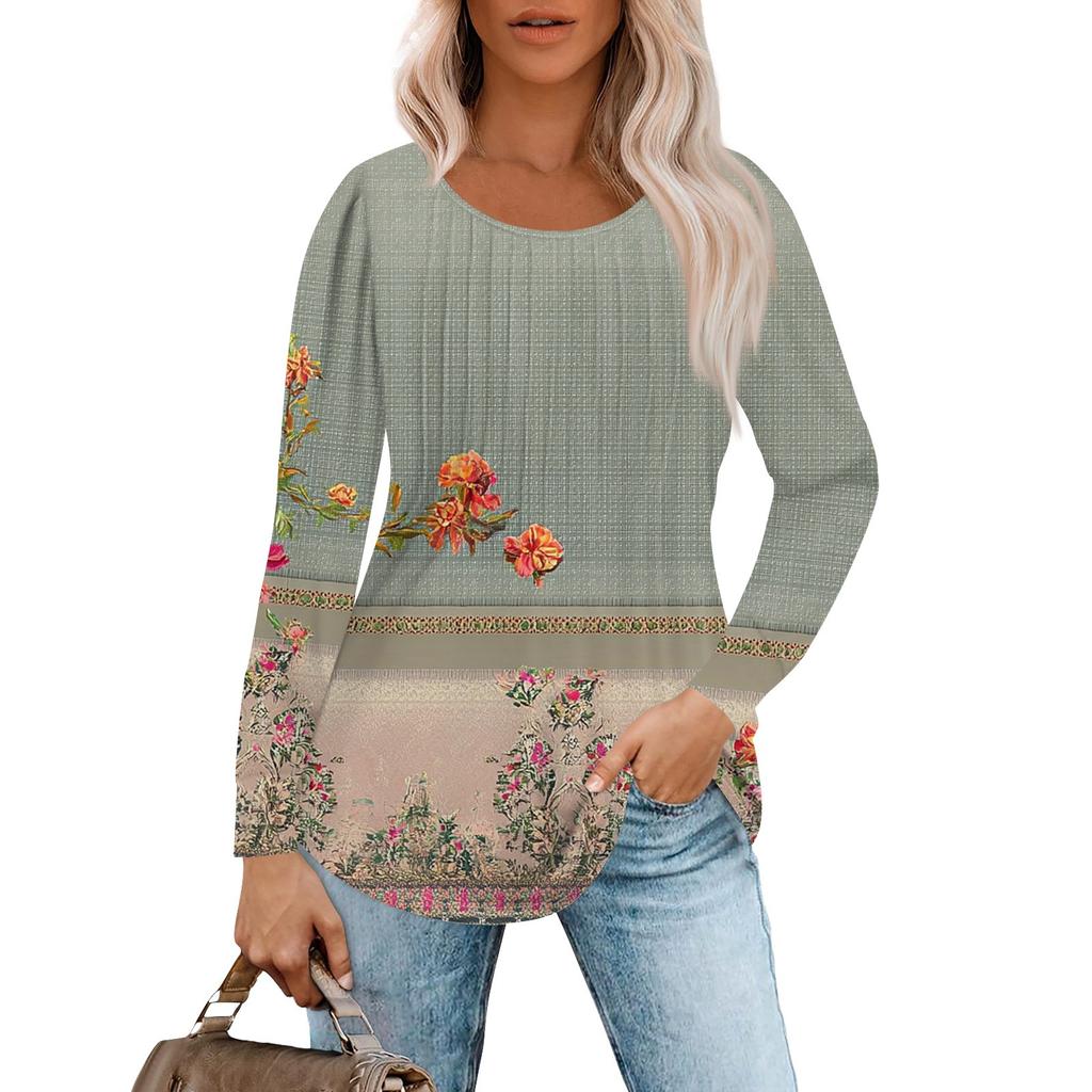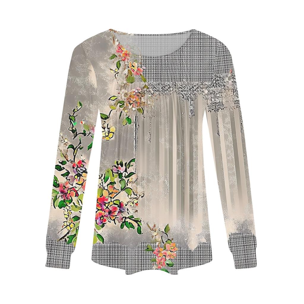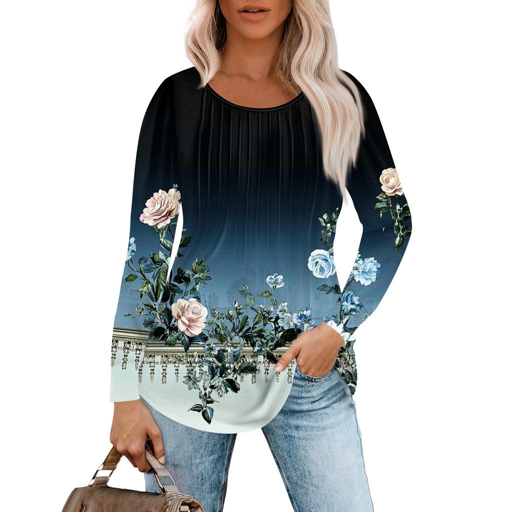 Женская модная повседневная плиссированная футболка с круглым вырезом и принтом, с длинным рукавом