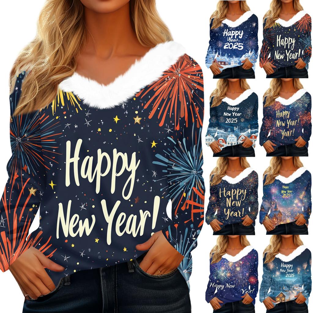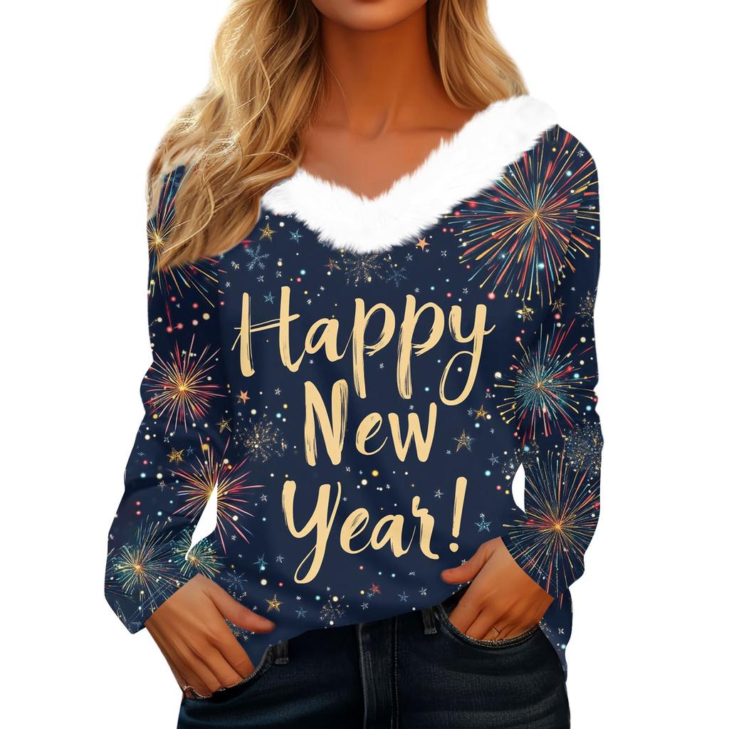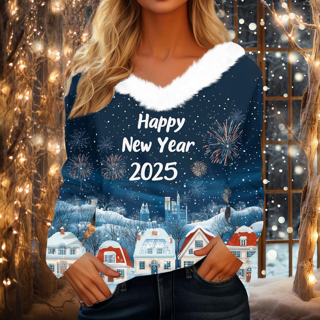 Женская рождественская рубашка с длинным рукавом и принтом V-образным вырезом, повседневная свободная футболка, топы