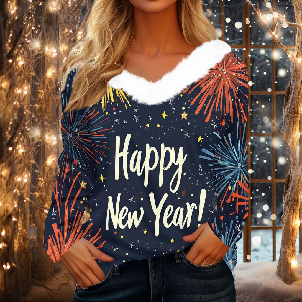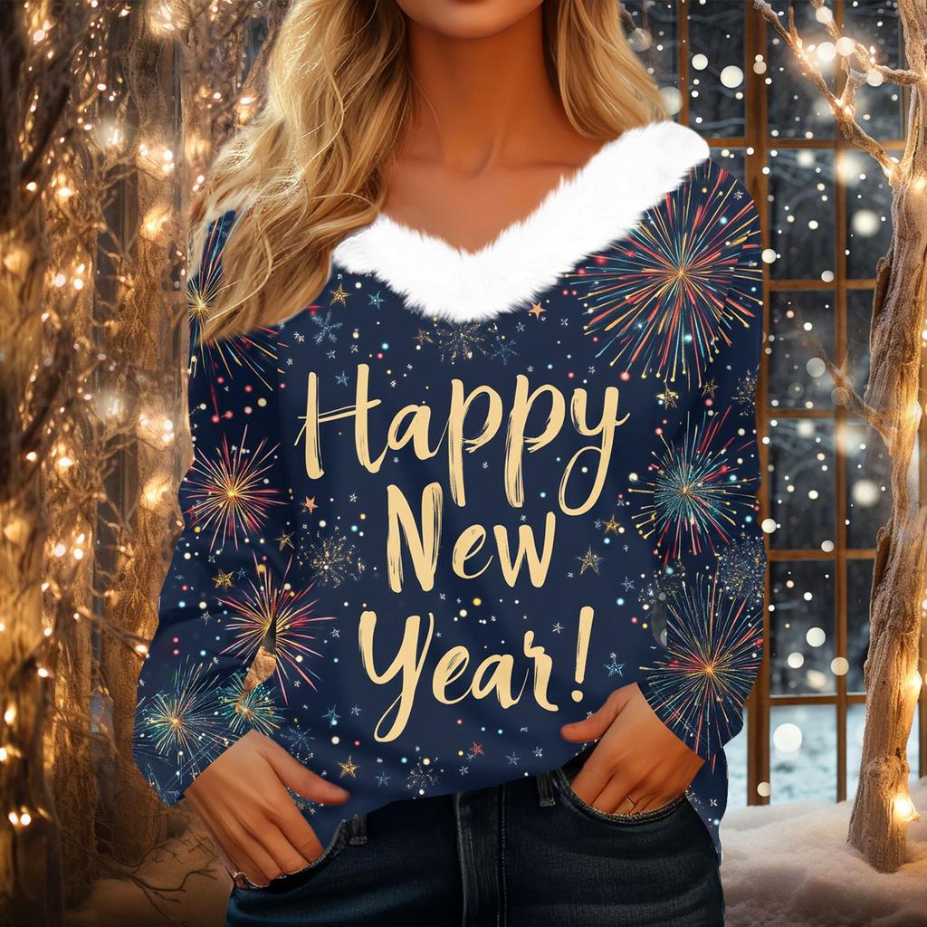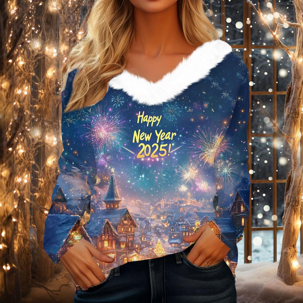 Женская рождественская рубашка с длинным рукавом и принтом V-образным вырезом, повседневная свободная футболка, топы