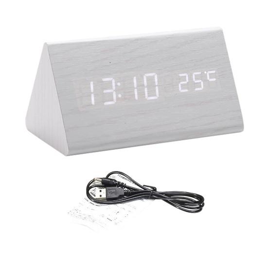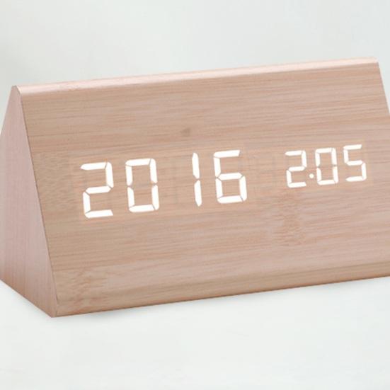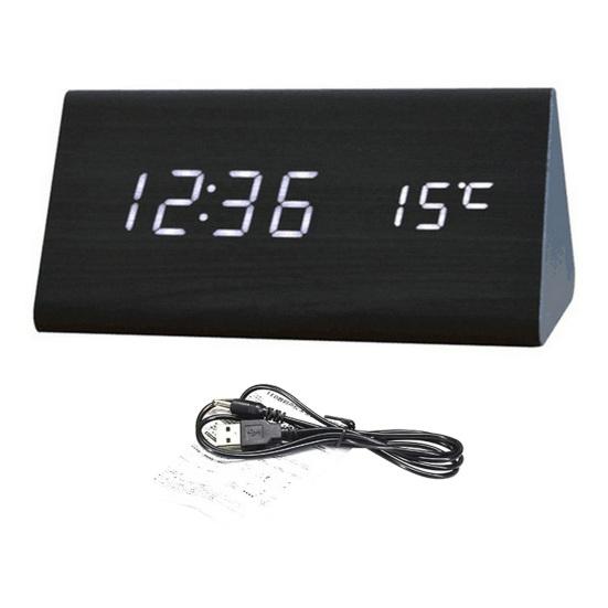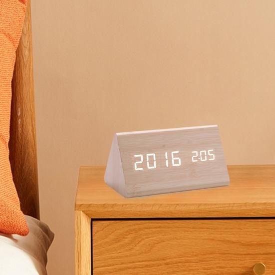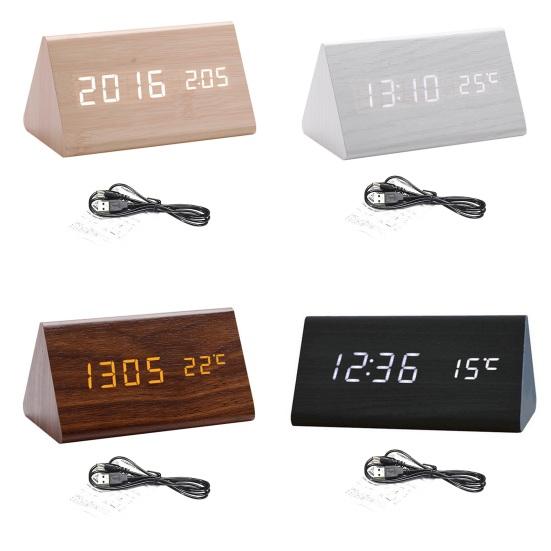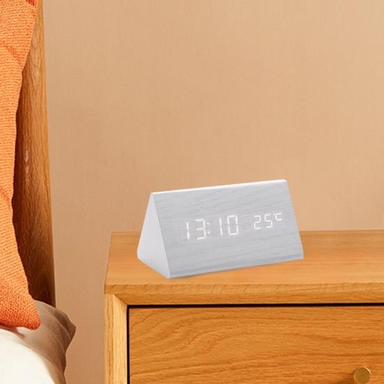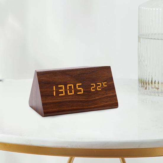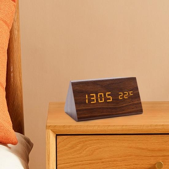 Минималистичный деревянный дизайн: Эти треугольные гладкие цифровые часы с текстурой дерева добавят элегантности вашей гостиной, идеально дополняя полку для телевизора и ТВ-бокс. Его чистые светодиодные номера позволяют легко считывать время под любым углом.