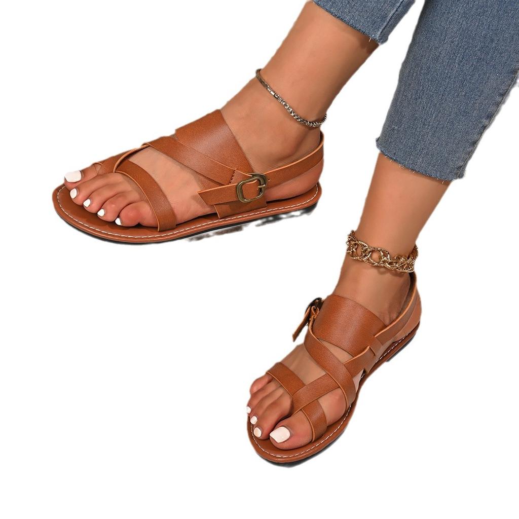 Сандалии на плоской подошве женские летние 2024 года с круглым носком и пряжкой-ремешком, модные женские туфли большого размера