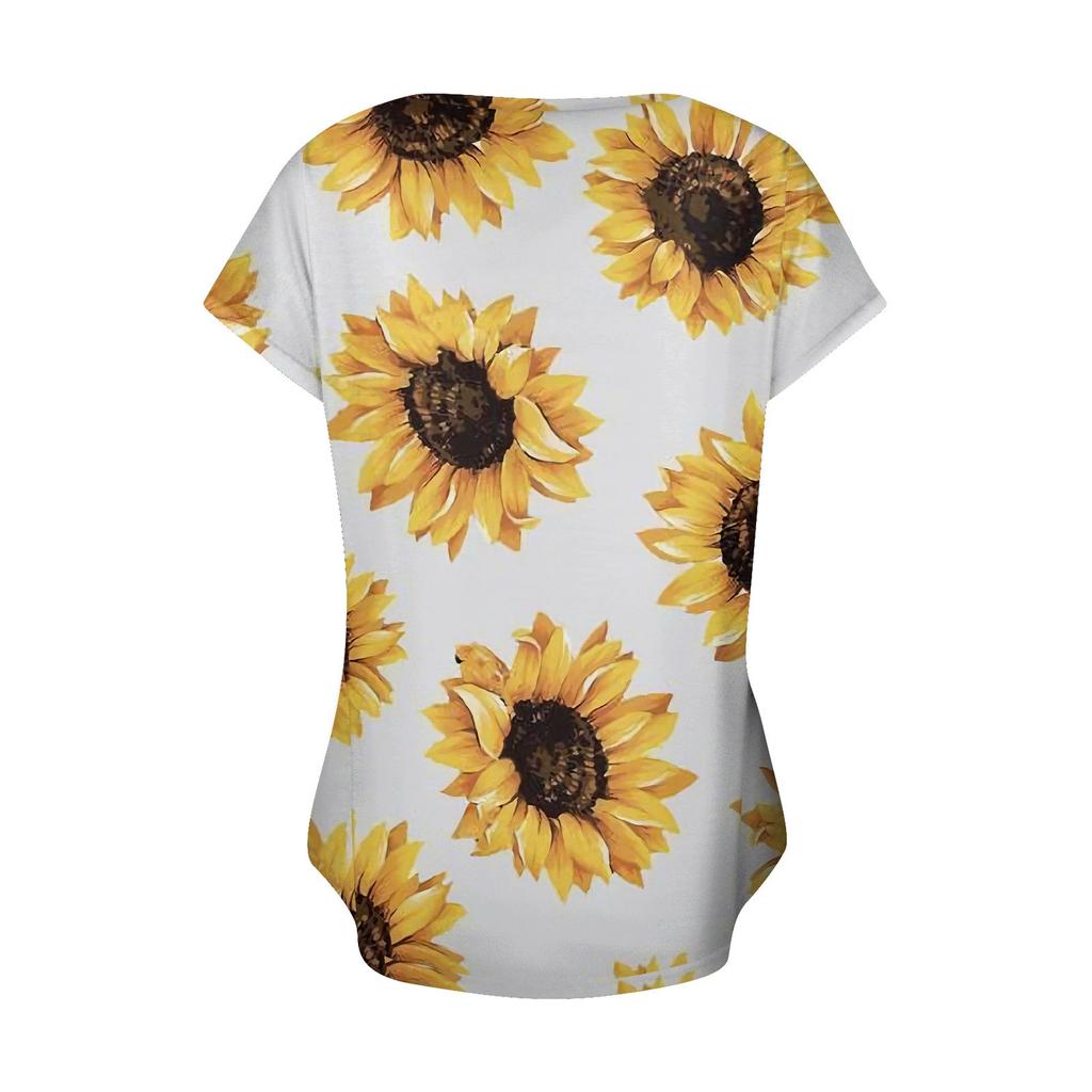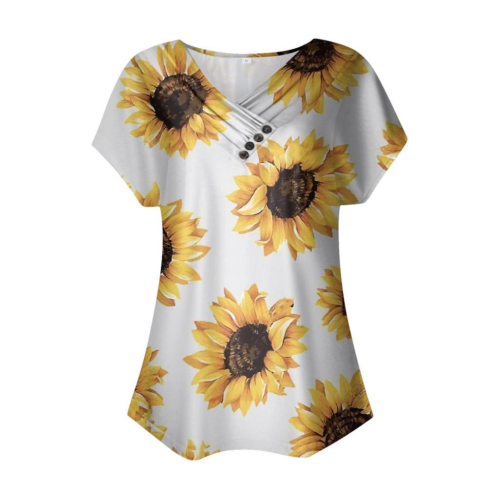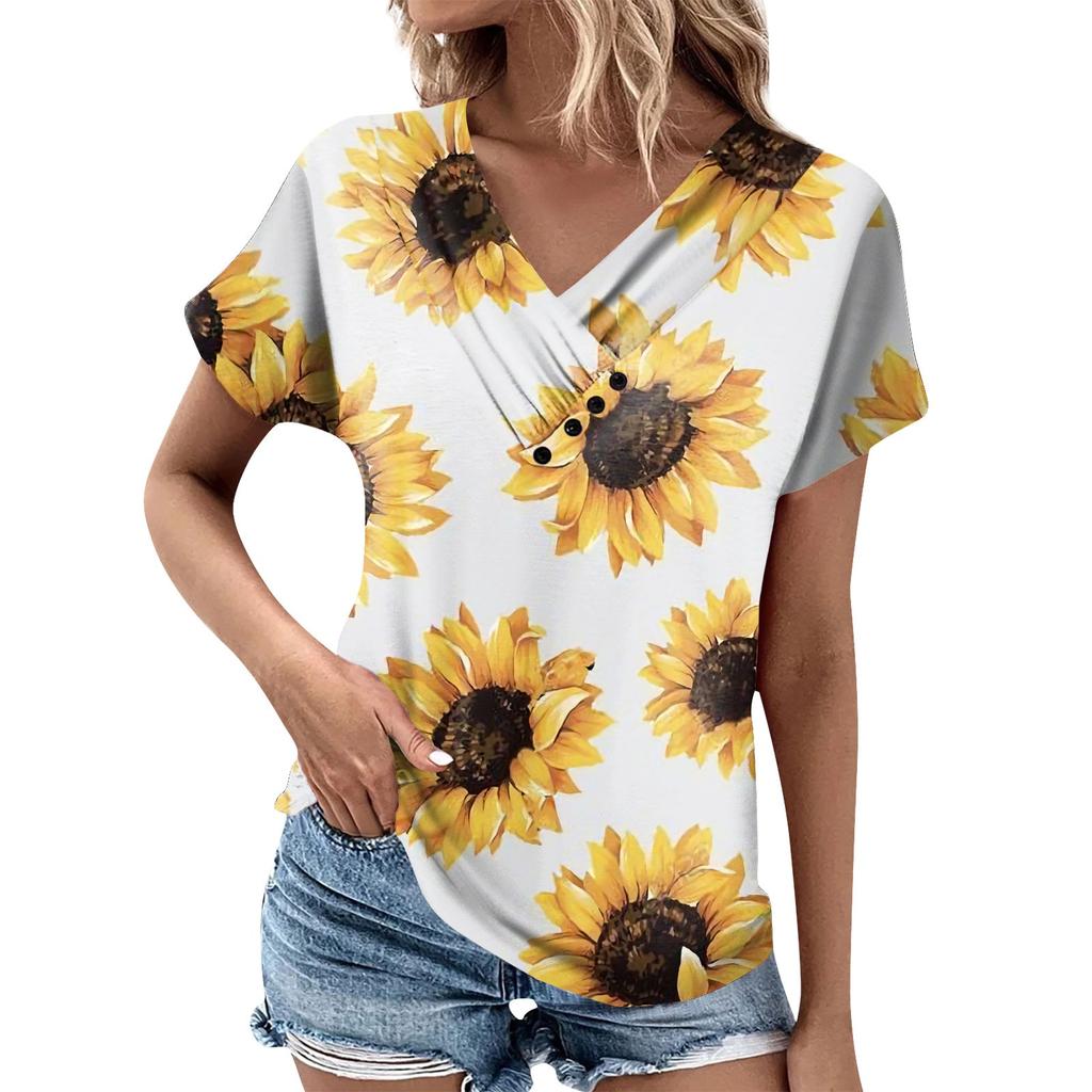 Женская модная футболка с принтом подсолнечника, плиссированный топ на пуговицах с v-образным вырезом и короткими рукавами
