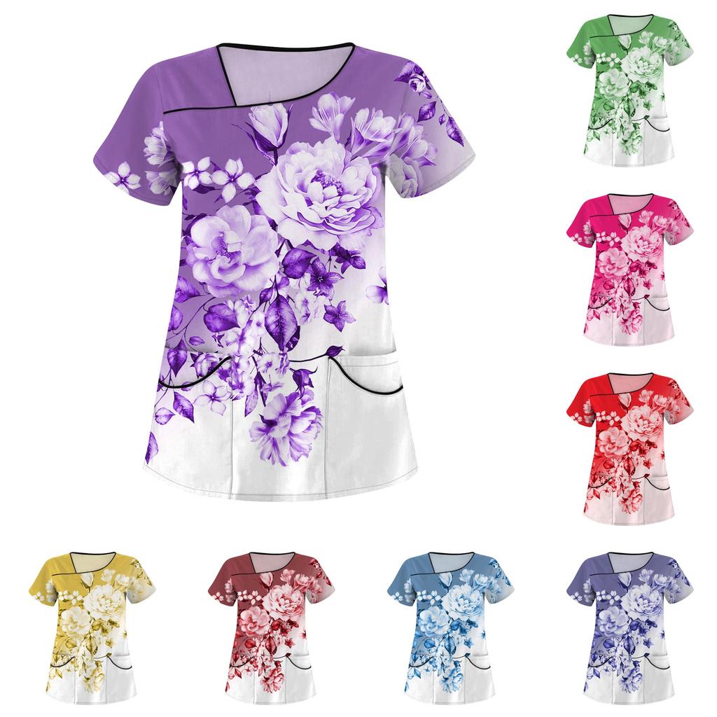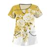 Женская повседневная рабочая одежда с цветочным принтом и коротким рукавом с наклонным воротником и двойными карманами
