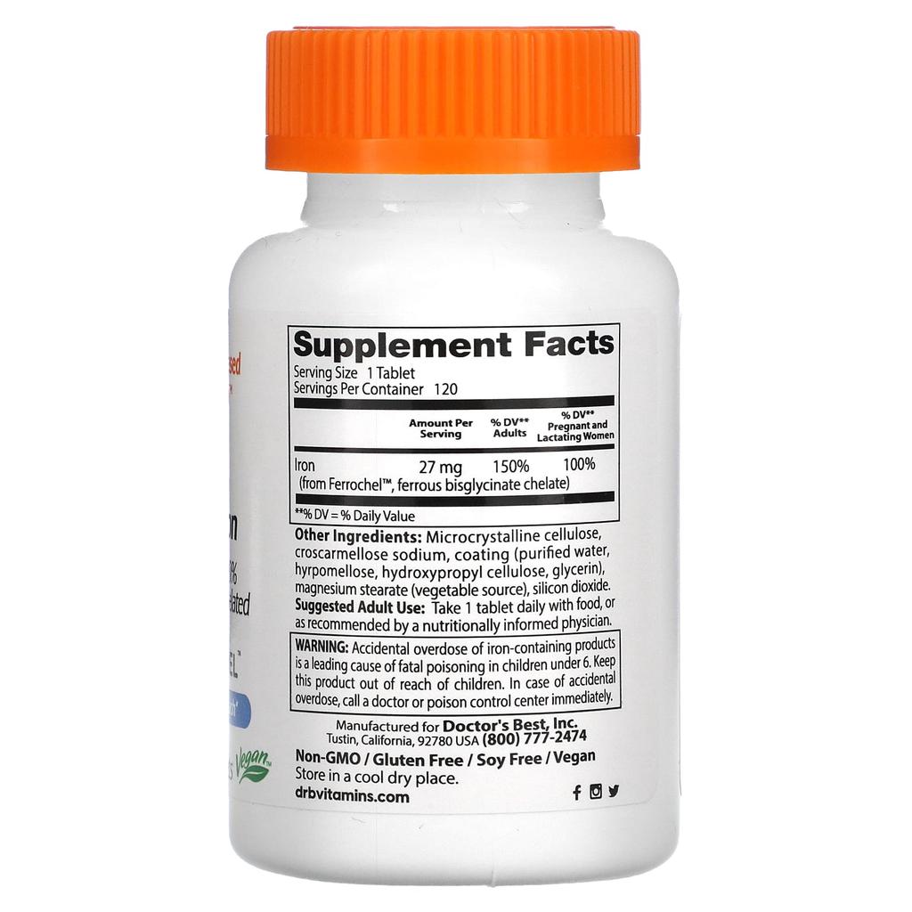 Product Description: Science-Based Nutrition™100% ChelatedGarden on the StomachAlbion MineralsSupplementVegan FreeGMO-Free, Gluten-Free,Soy-FreeDoctor's Best High Absorption Iron Supplement with Ferrochel™ contains chelated iron, The utilization rate is high. Chelation optimizes iron absorption in the body and does not cause irritation to the digestive system. Iron is an essential mineral that helps with normal red blood cell production and is an important component of hemoglobin, which carries oxygen throughout the body. Iron plays a key role in folic acid metabolism, which is important for fetal nervous system development. The most common cause of anemia is iron deficiency. Ferrochel™ iron is chelated with bisglycinate amino acids for enhanced absorption and tolerance. Benefits: Provides adequate iron to the body, improves immune system health, creates cells