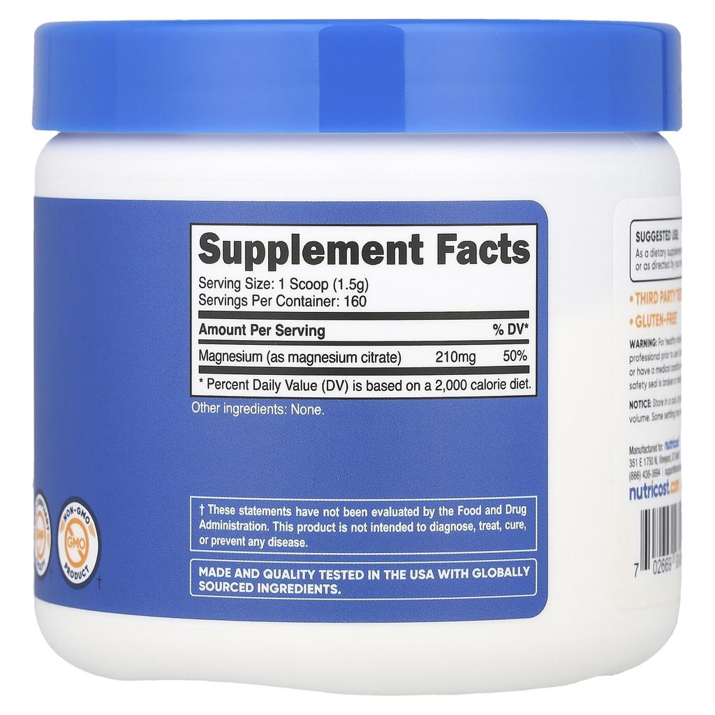 Nutricost Цитрат магния, без вкуса, 250 г (8,8 унций)