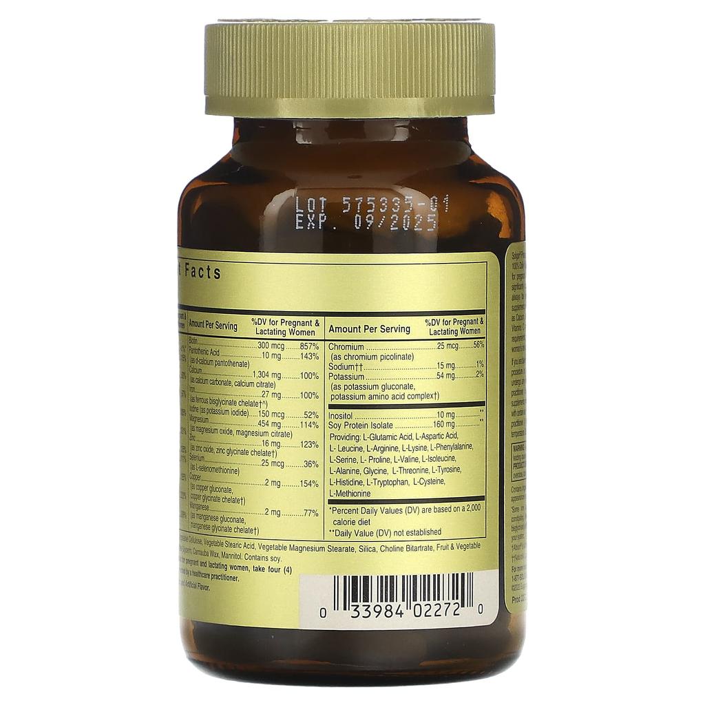 Описание товара: Основано в 1947 году. Поливитаминная и минеральная формула для беременных и кормящих женщин. Добавка. Подходит для веганов. Не содержит глютена, пшеницы и молочных продуктов. Не содержит генетически модифицированных ингредиентов. Халяль. Кошерный. Parv. Пренатальная добавка Solgar® предназначена для беременных и кормящих женщин.. Запатентованная формула, которая обеспечивает 100% суточной нормы большинства необходимых витаминов и минералов.. Во время беременности потребности в питании существенно меняются, и зачастую бывает трудно удовлетворить эти основные уровни питательных веществ только за счет диеты.. Эта добавка содержит сбалансированные питательные вещества, включая кальций, железо, фолиевую кислоту, а также антиоксиданты бета-каротин и витамины С и Е.. У беременных женщин потребность в железе еще выше. Добавление достаточного количества фолиевой кислоты в здоровый рацион питания может снизить риск рождения ребенка с дефектами головного или спинного мозга.