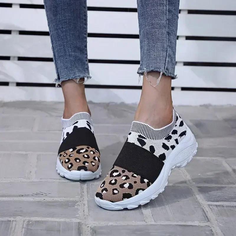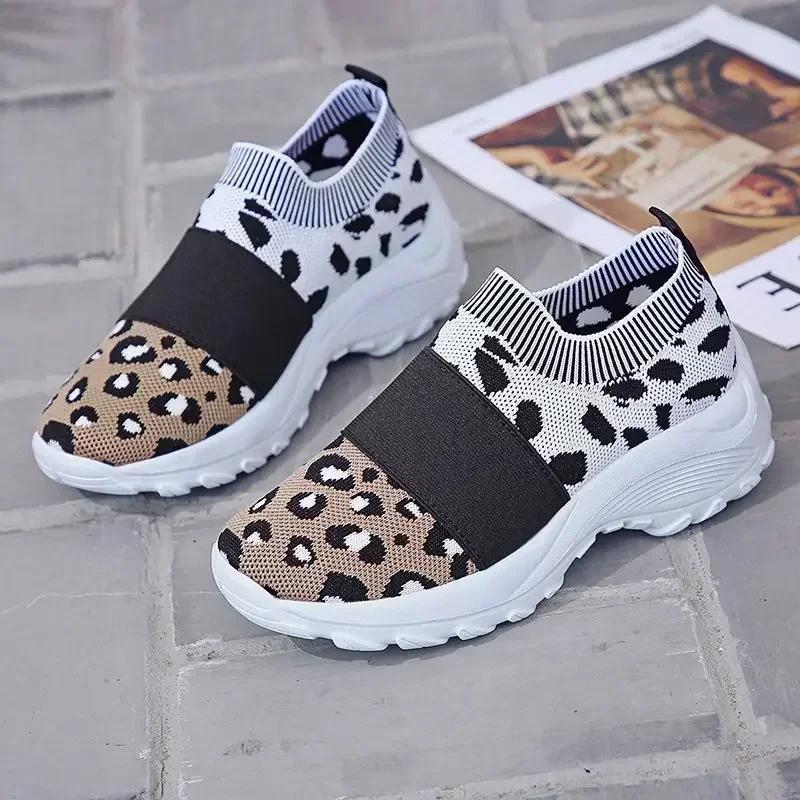 2024 Новые женские кроссовки с леопардовым принтом для ходьбы, фитнеса, на толстой платформе, увеличивающие рост, дышащие мокасины, эластичные кроссовки