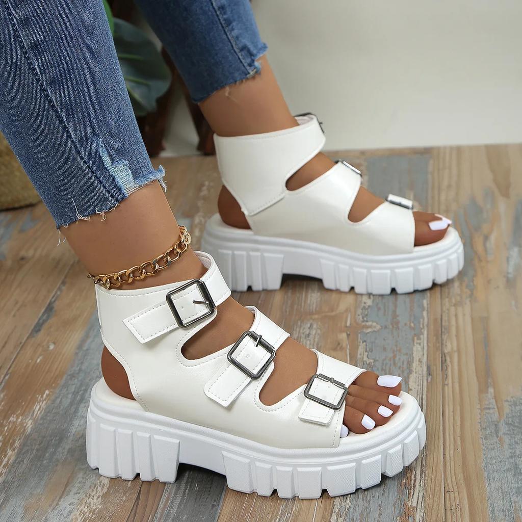 2024 Горячая Распродажа Толстая Подошва Пряжка Ремня Римские Туфли Для Ношения Большой Размер Маффин Ретро Сандалии Мода Открытый Носок Женская Обувь