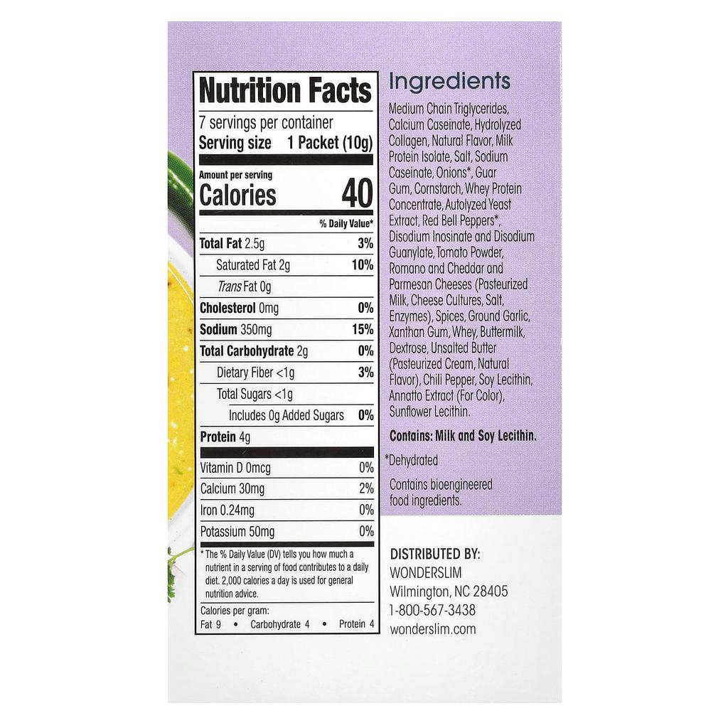 Product Description: Contains MCT Oil Powder, Natural Flavors, 40 Calories, Sugar <1g, Carbohydrates, 2g, WonderSlim Foods that are not only delicious but also nutritious, are perfectly formulated for healthy weight loss and weight management. Take as prescribed in the WonderSlim diet plan or as part of a low-calorie diet.