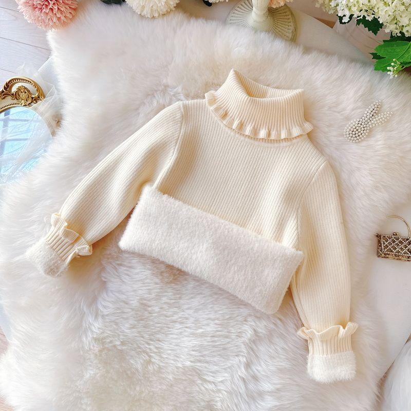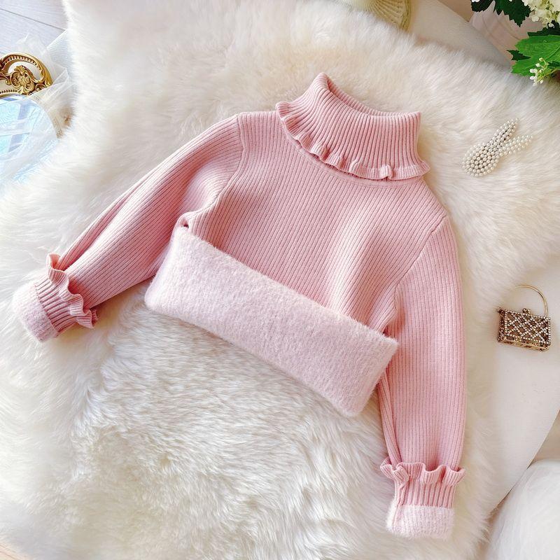 Свитер для девочек с высоким воротником и кружевным воротником. Зимний цельный бархатный детский однотонный свитер с толстым бархатным свитером.