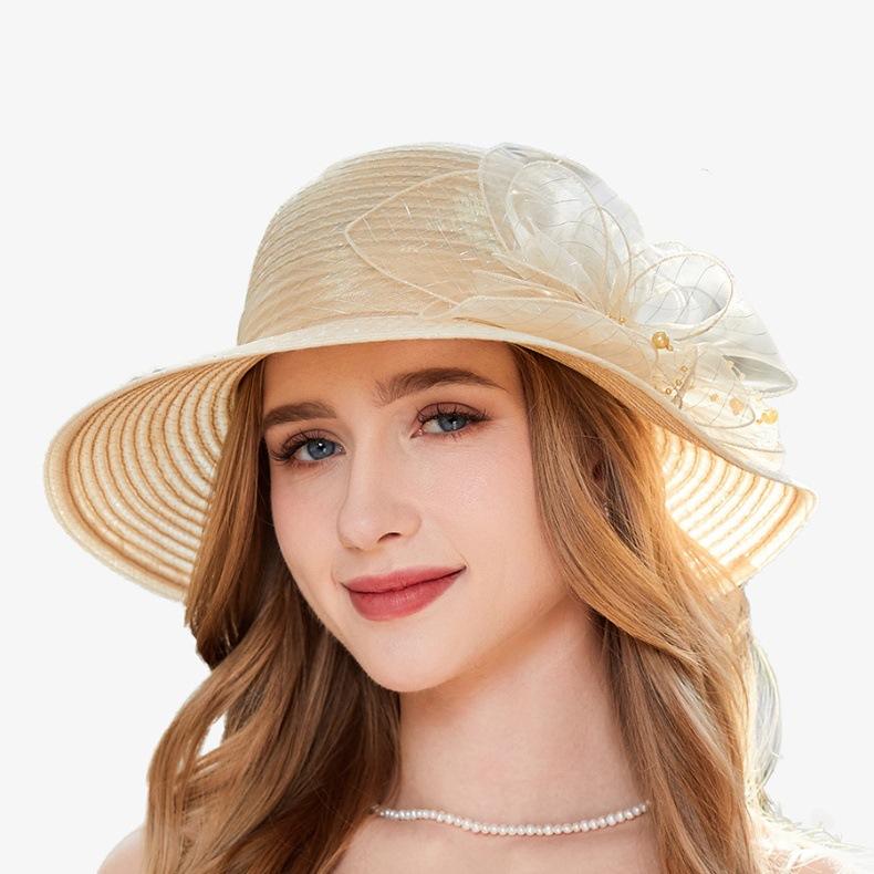 Новые шляпы от солнца из органзы с цветком, женские летние шляпы для свадебной вечеринки, шляпы для церкви, женские солнцезащитные шляпы для путешествий и пляжа с защитой от ультрафиолета