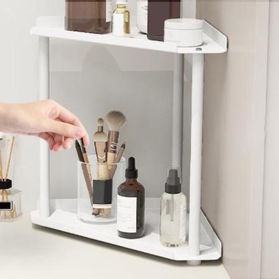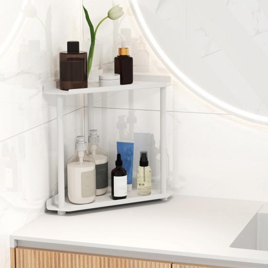 Каждый уровень этого стеллажа для хранения оснащен ограждениями, которые надежно фиксируют ваши вещи, а нескользящие ножки обеспечивают устойчивость.. Угловая столешница легко вписывается в ограниченное пространство, обеспечивая безопасное и организованное решение для хранения туалетных принадлежностей.