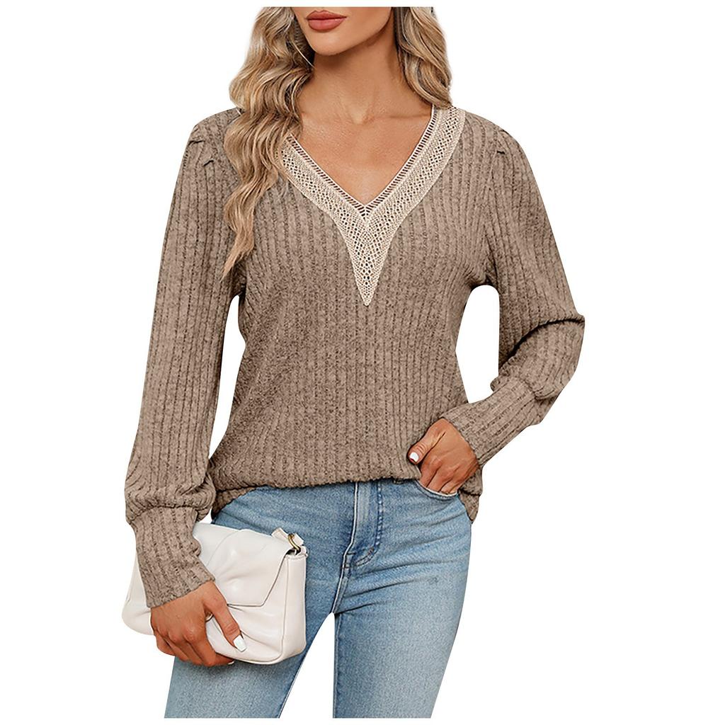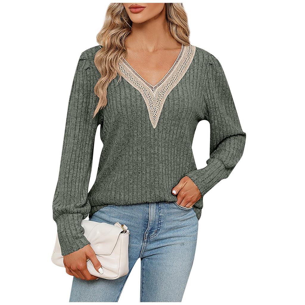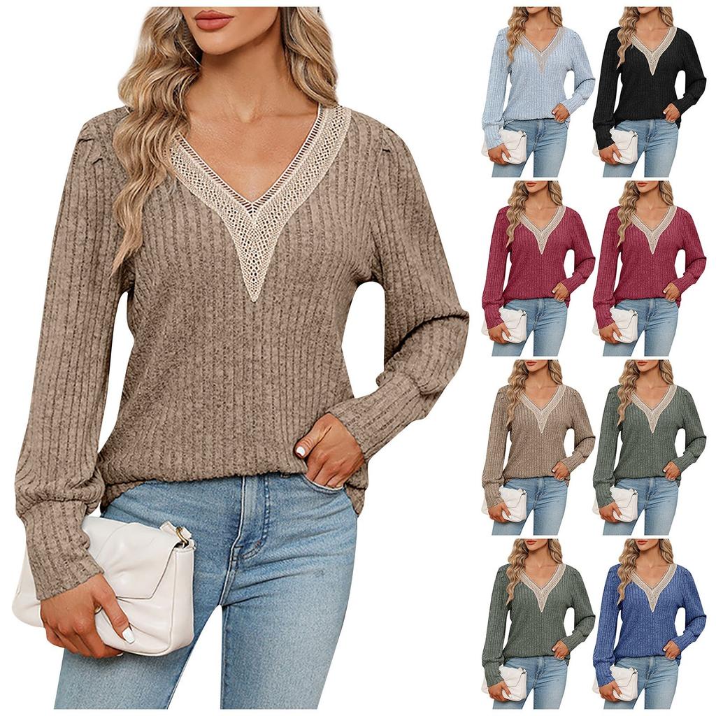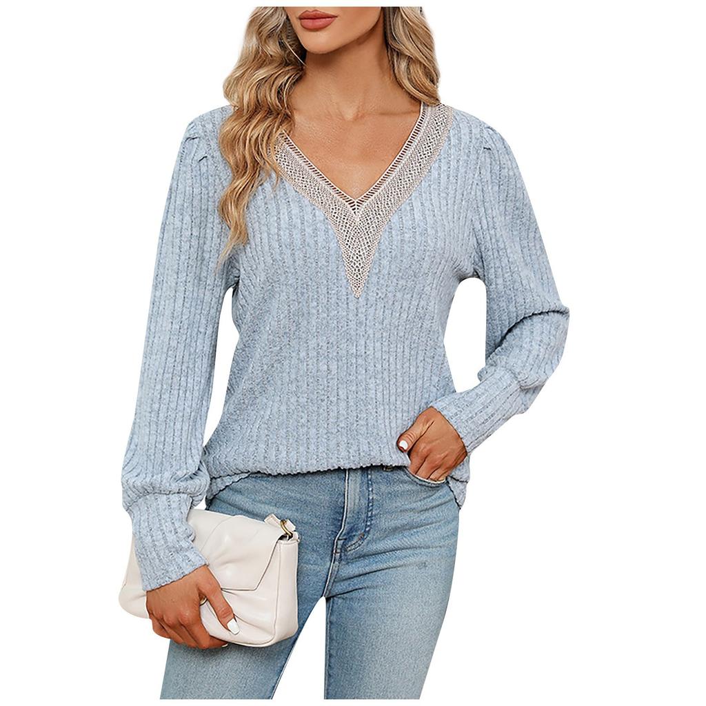 Женский повседневный модный пуловер с v-образным вырезом, однотонный, свободный, с длинными рукавами и кружевной кромкой, однотонная футболка