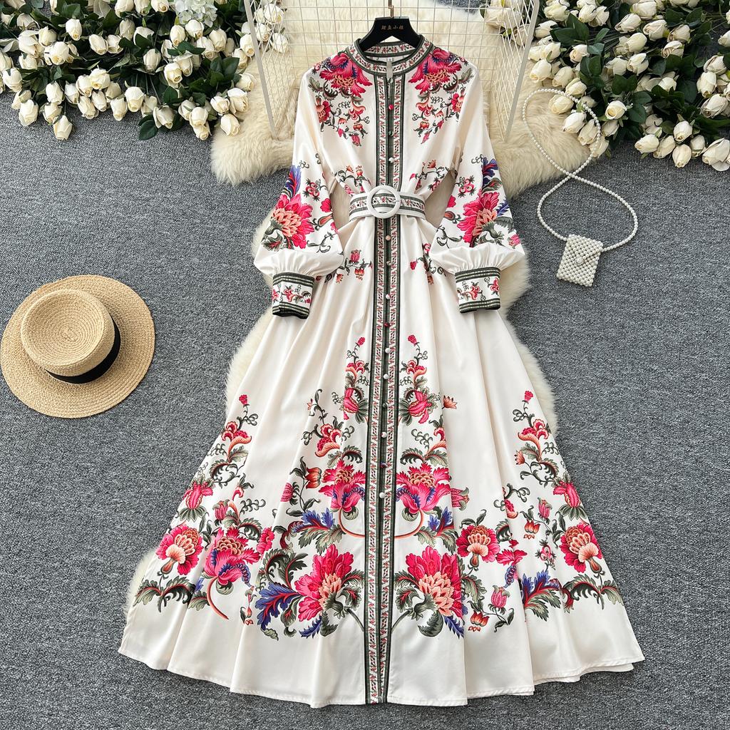 Весенние женские однобортные платья с воротником-стойкой и винтажным принтом, длинные макси, для пляжной вечеринки, с поясом
