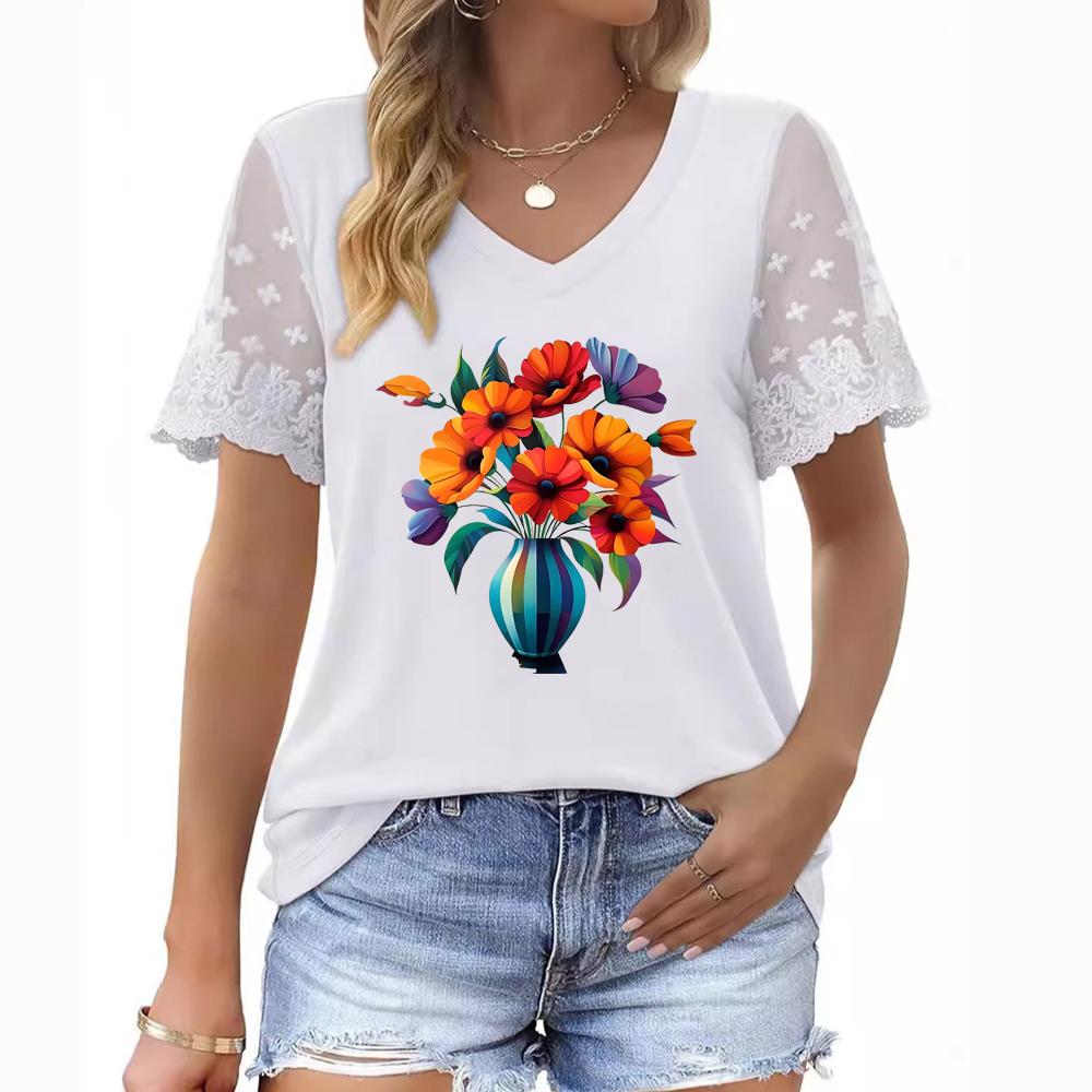 Новые поступления женской одежды больших размеров: Топ с короткими рукавами и V-образным вырезом, кружевными деталями и цветочным принтом на лето — купить товар онлайн с бесплатной доставкой по всему миру!